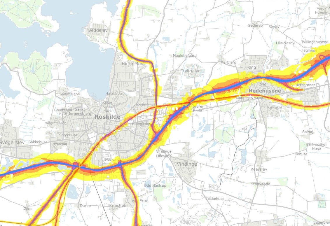 Støjdanmarkskortet giver et visuelt overblik over støjbelastningen langs de største veje og jernbaner og i de største byområder.