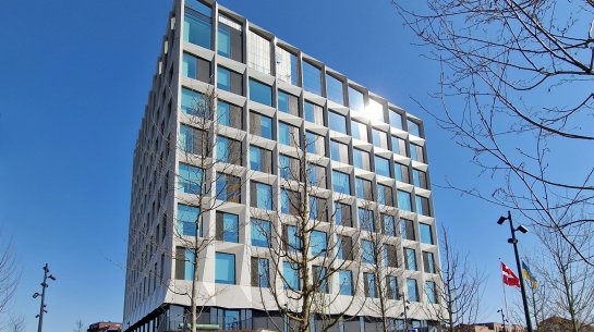 Vi har udført projektet ved hjælp af etagehøje, præfabrikerede facadeelementer, der er modulopbygget i HansenUnitAl-systemet.