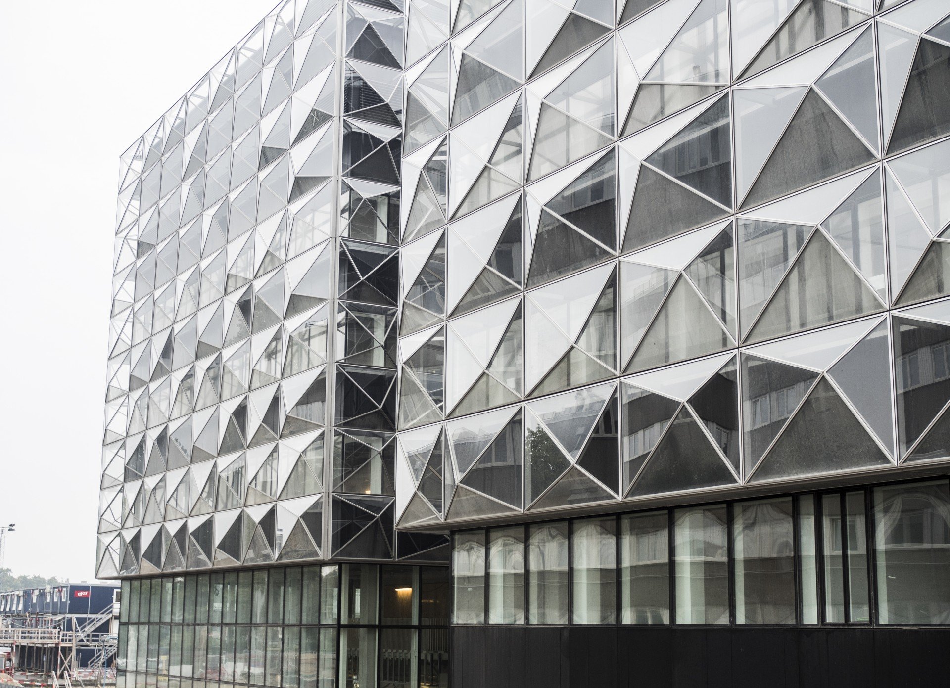 Den yderste facade består af en såkaldt ”pixel-facade” som opbygges af mange pyramide-formede felter.