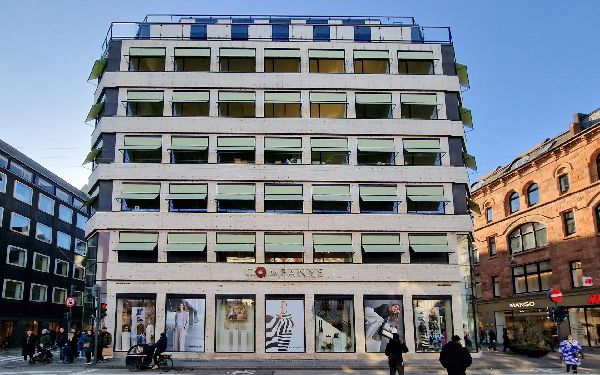 Travertinbeklædningen på gadefacaderne er blevet repareret, og de keramiske gesimsbånd er blevet genoprettet og gavlene har fået felter af indfældede solceller.