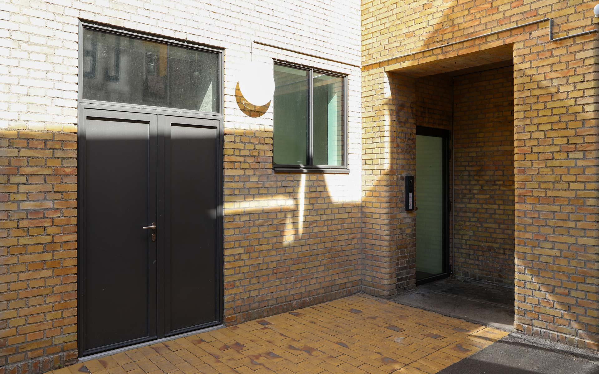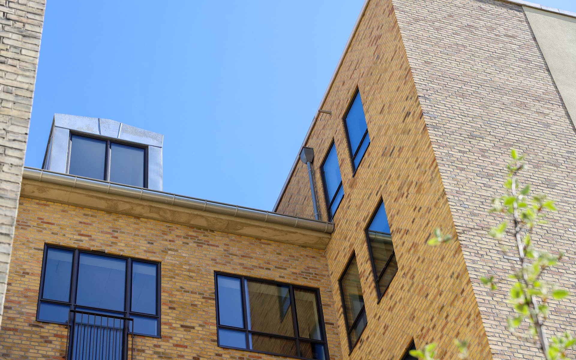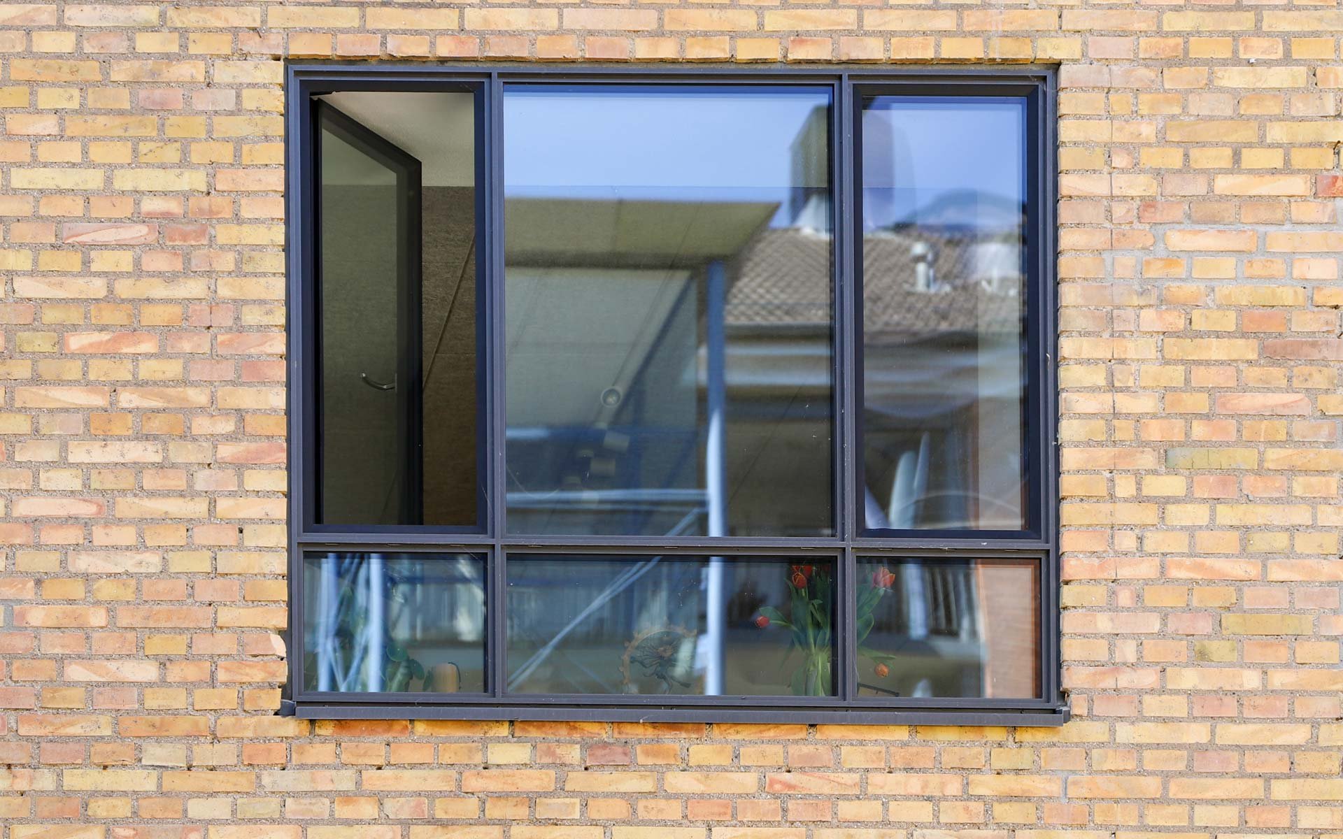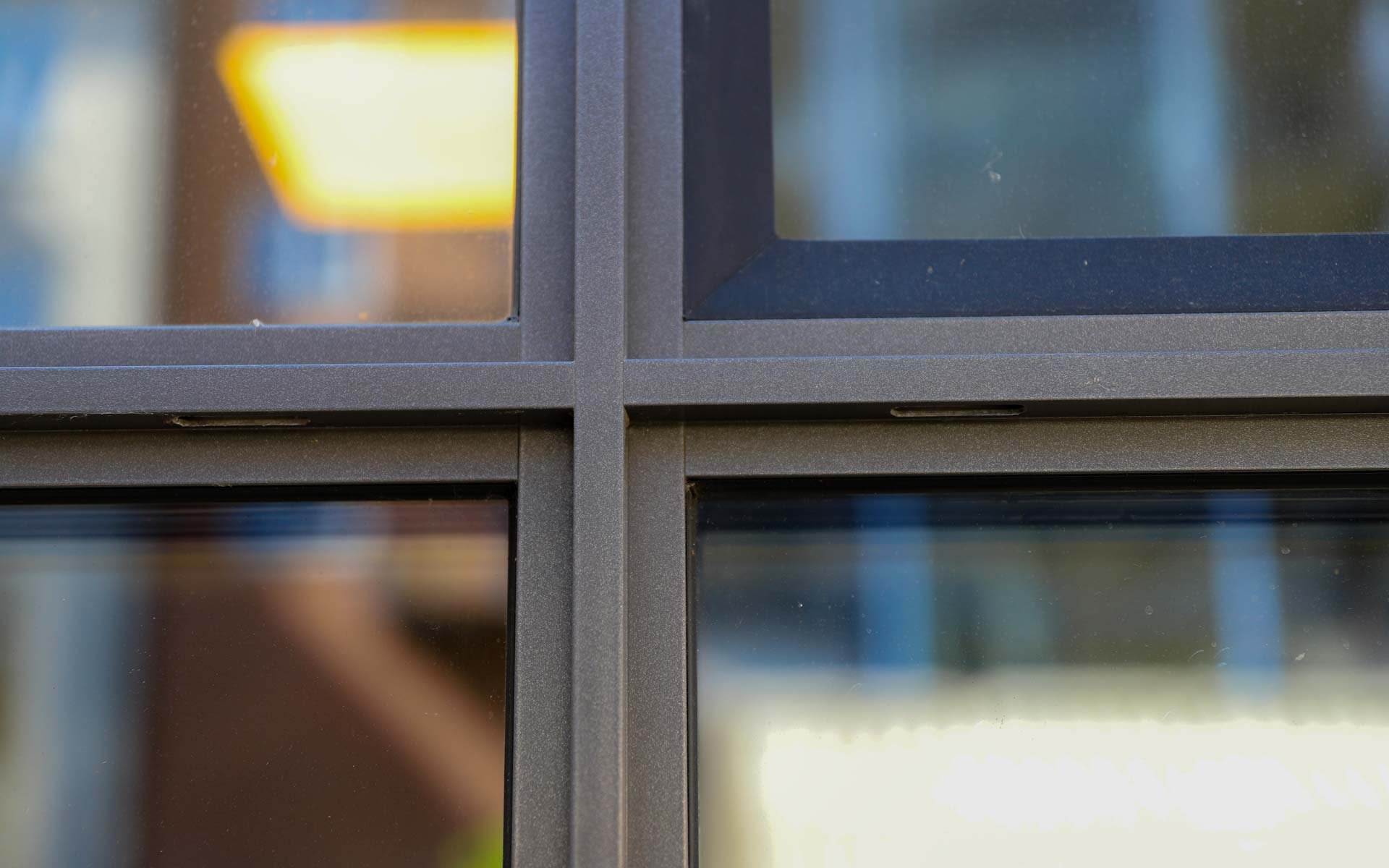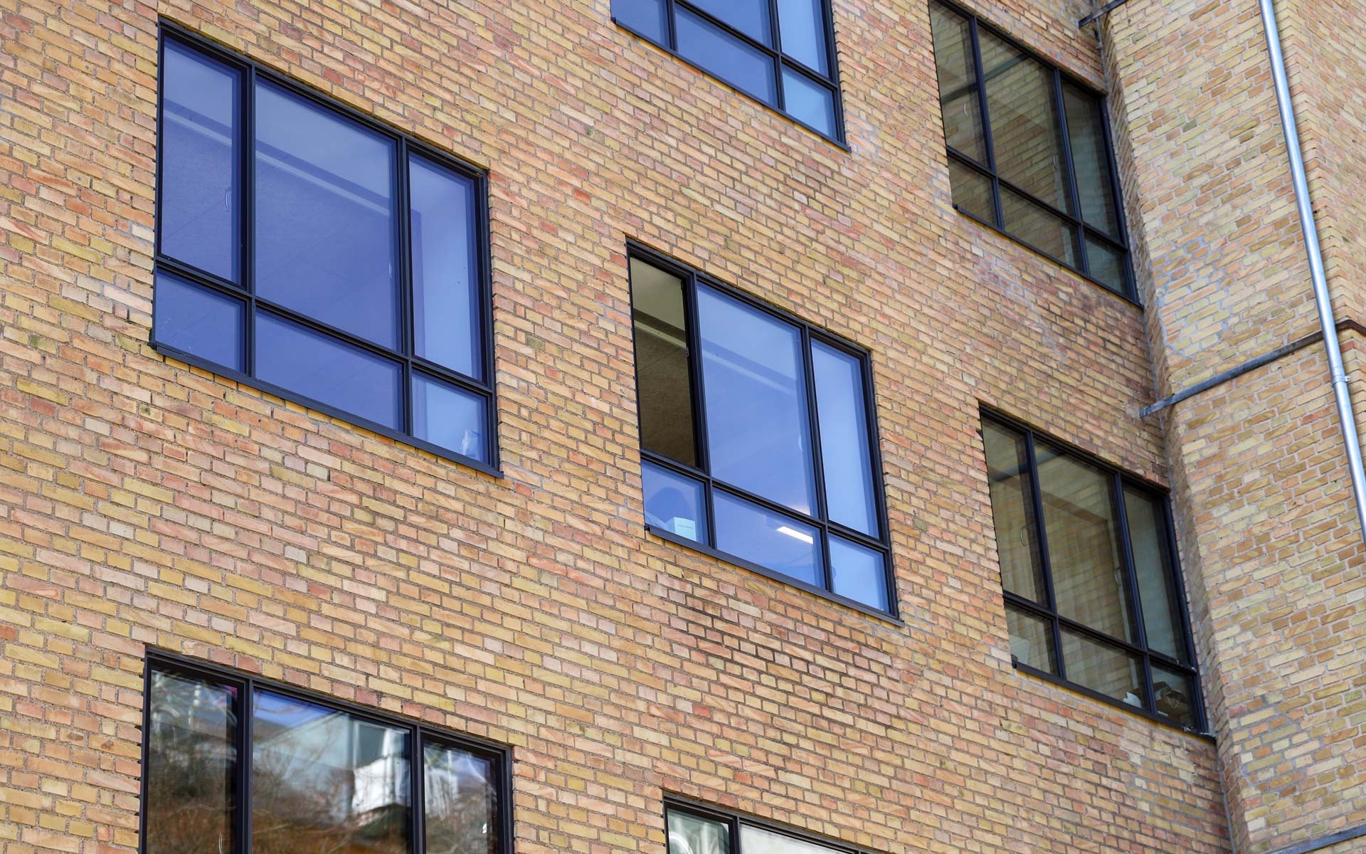 Stilen er fortsat holdt lidt industriel, så man kan se de bærende betonbjælker og de store vinduespartier er holdt i mørke rammer med GSB / Qualicoat pulverlakering farve DC386MP, mat glans 30 +/- 7, korrosionsklasse C3.