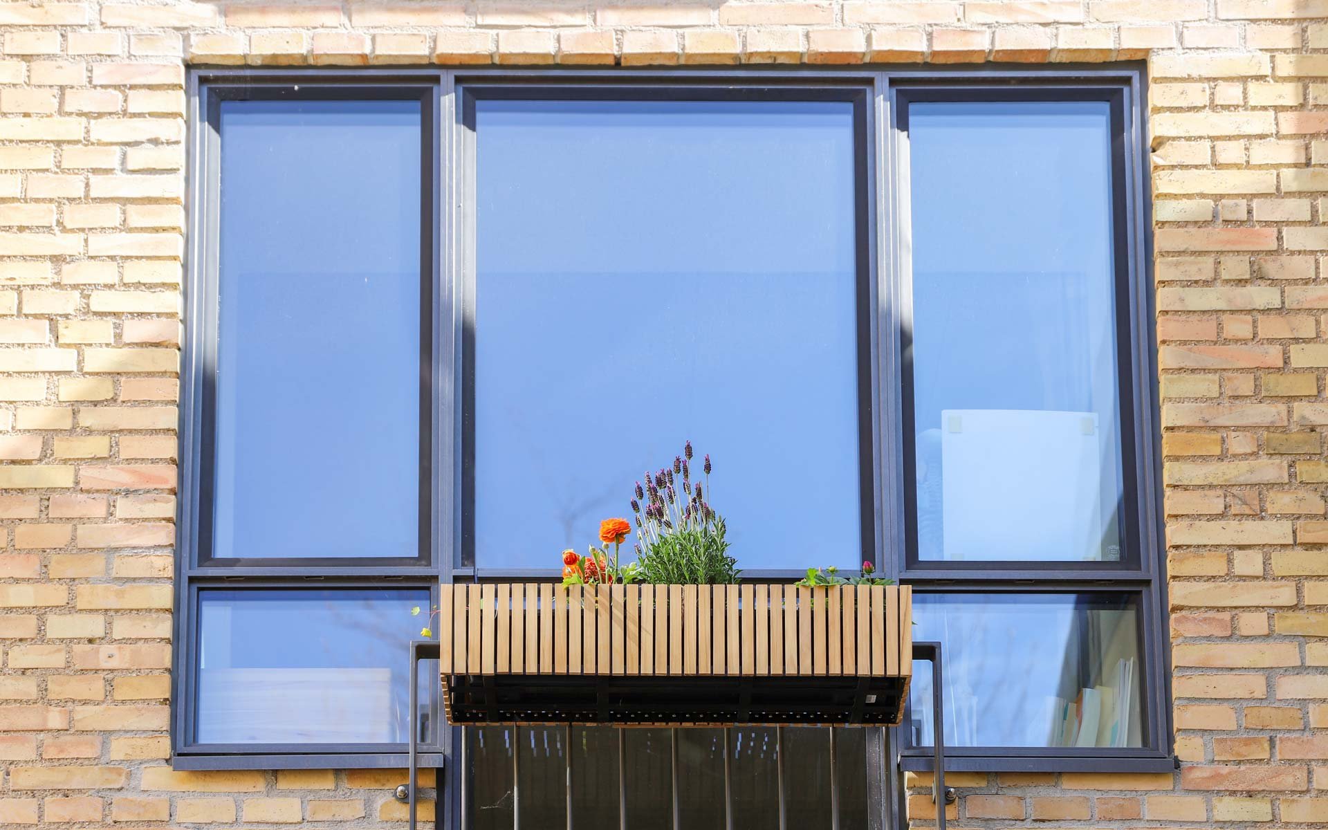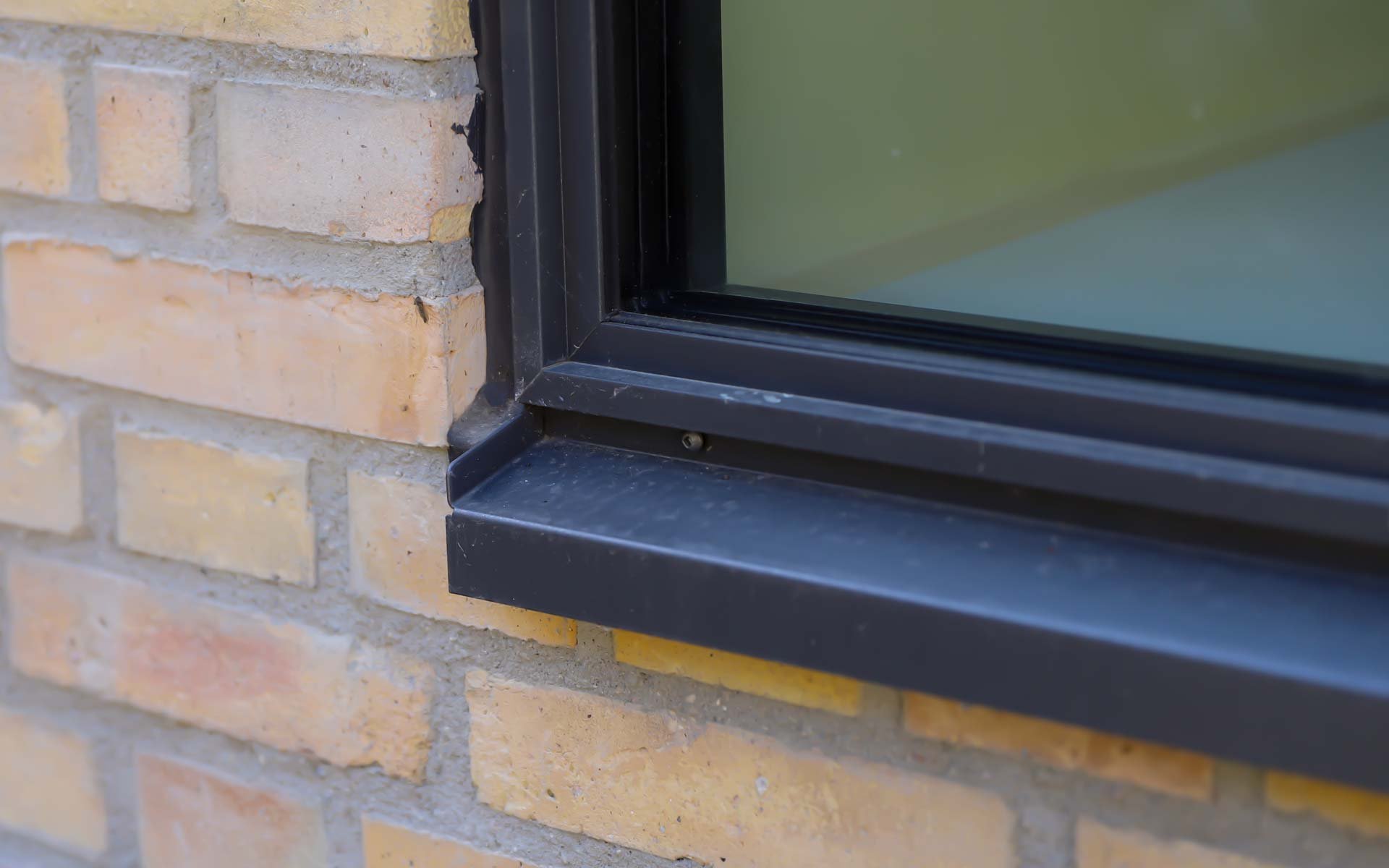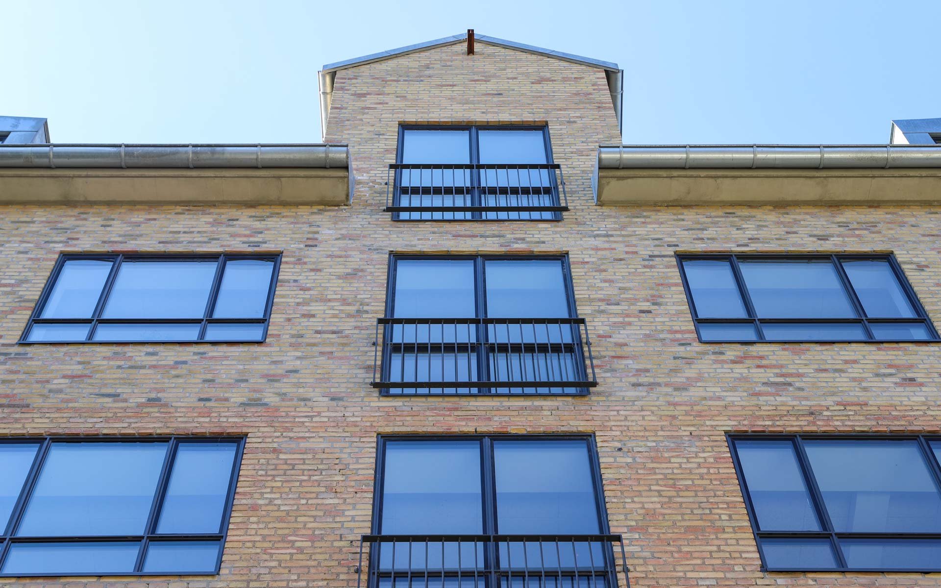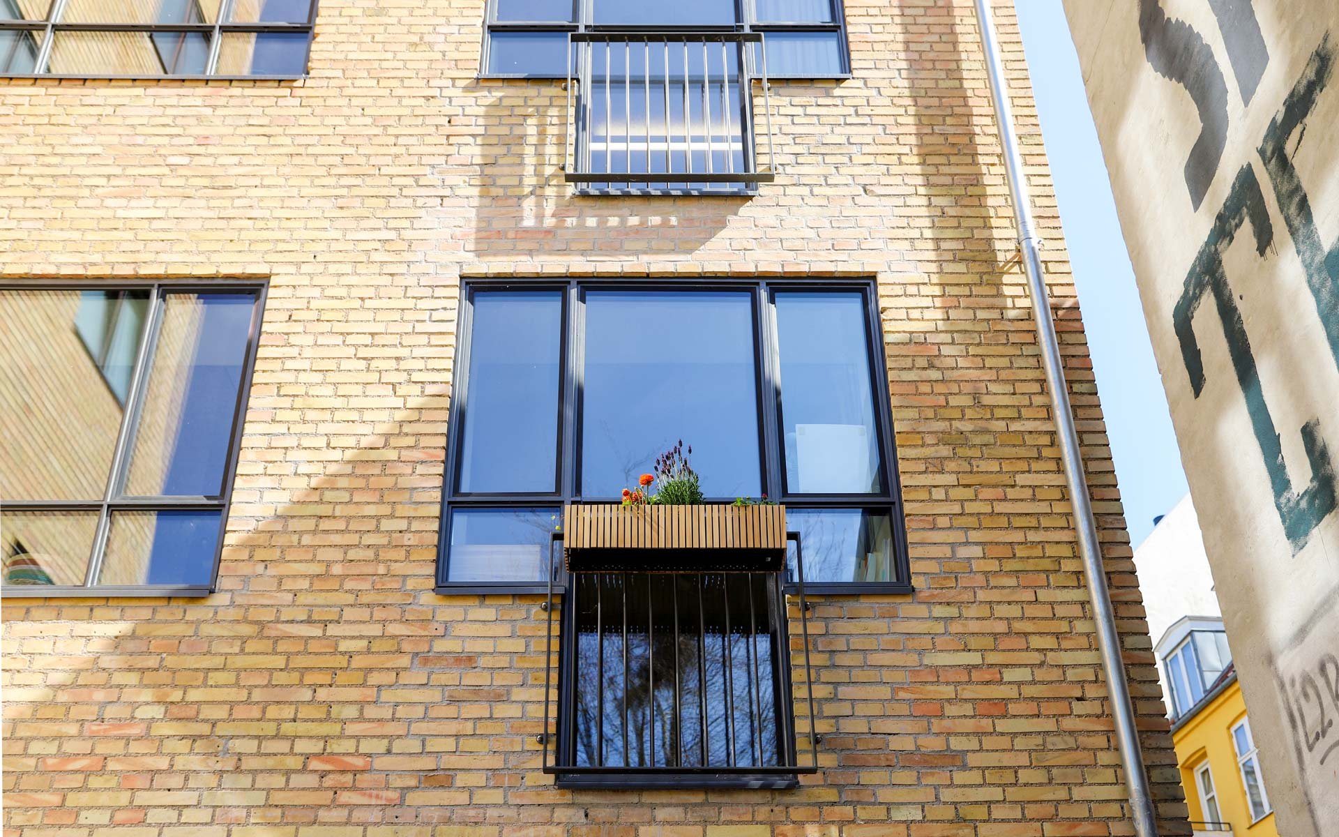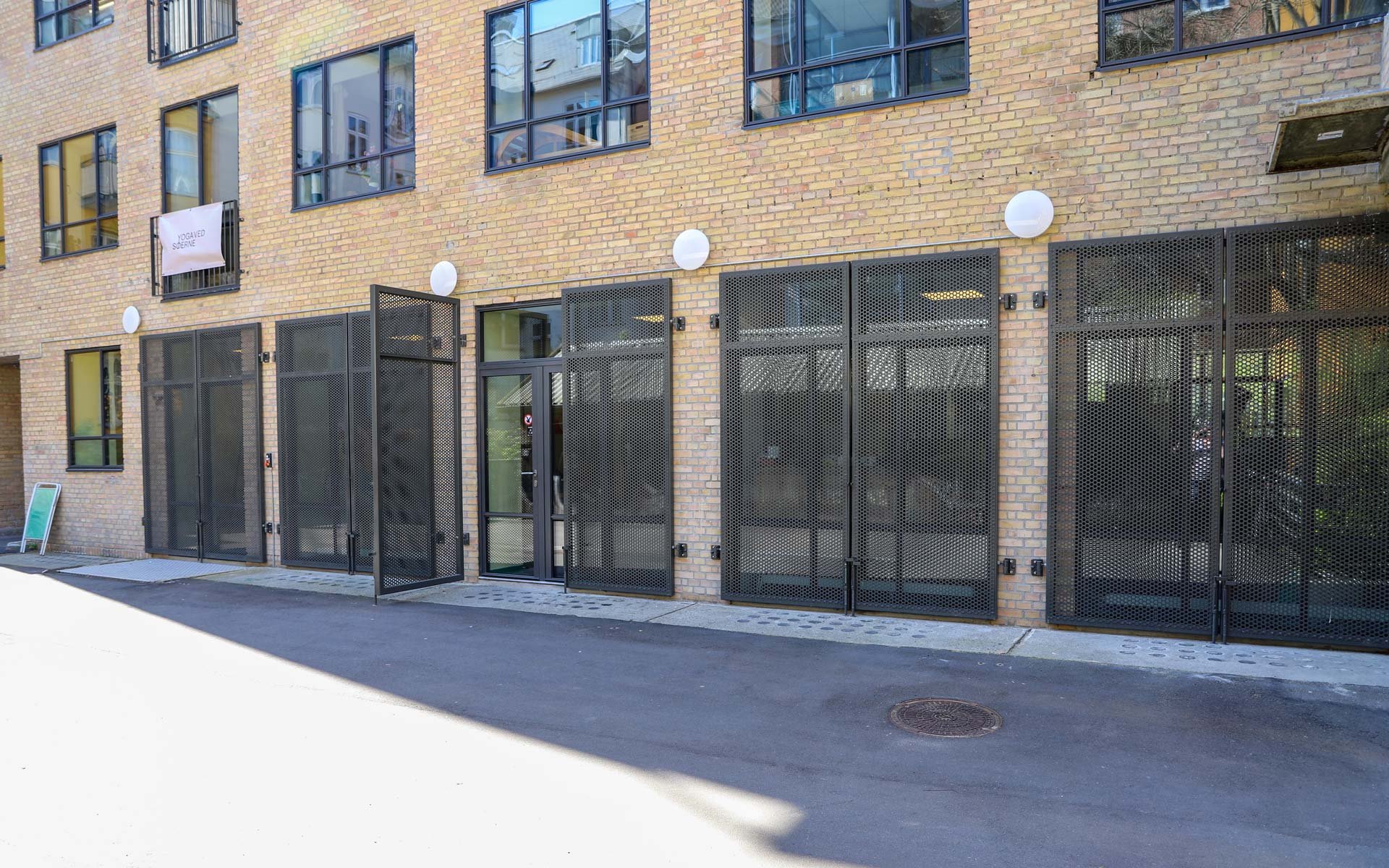 Stilen er fortsat holdt lidt industriel, så man kan se de bærende betonbjælker og de store vinduespartier er holdt i mørke rammer med GSB / Qualicoat pulverlakering farve DC386MP, mat glans 30 +/- 7, korrosionsklasse C3.
