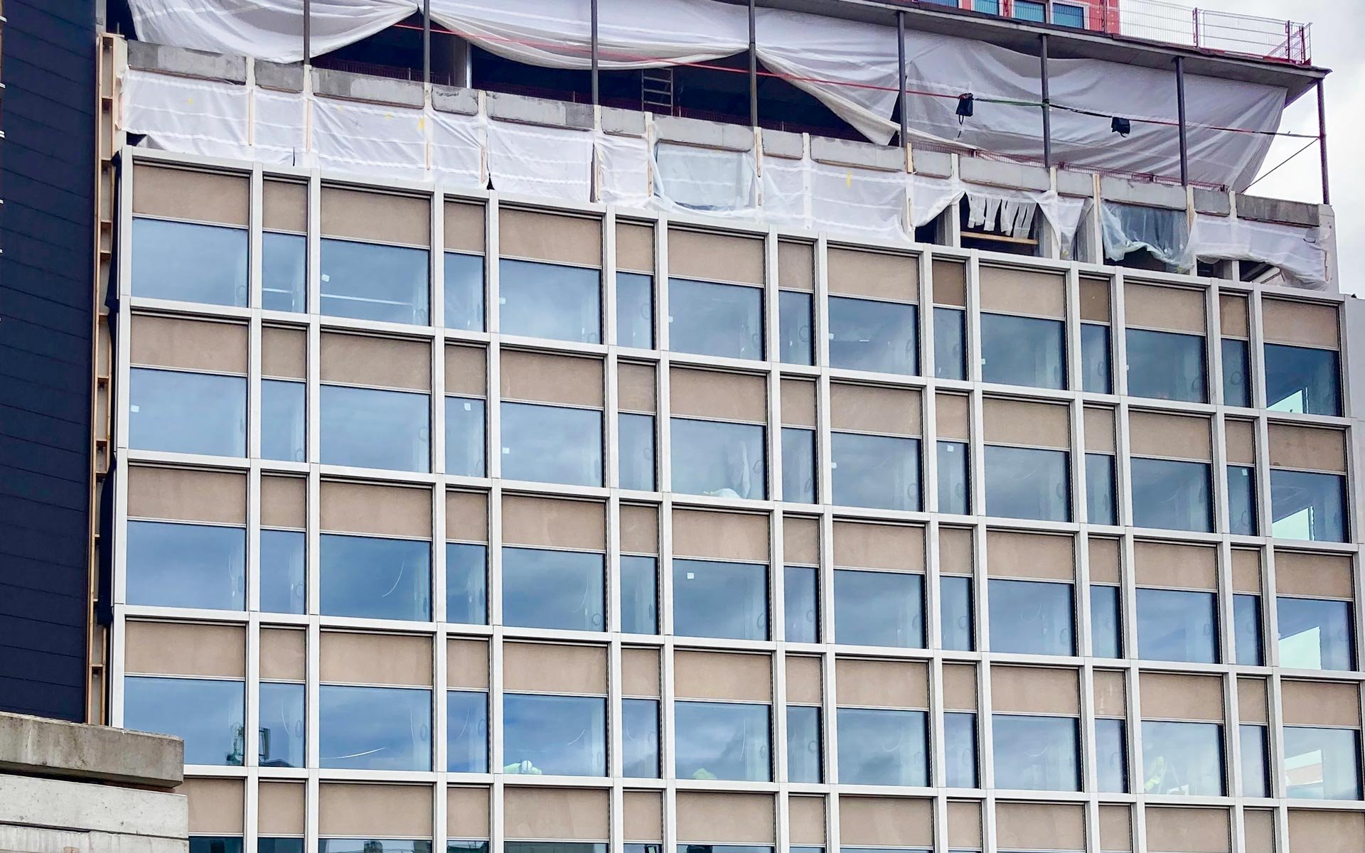 Elementerne er udført med 3-lags termoruder og blændfelter (vindplade) i fuld etagehøjde og med fastgørelse på betonopkant ved hver etage. Desuden monteres udvendig solafskærmning.