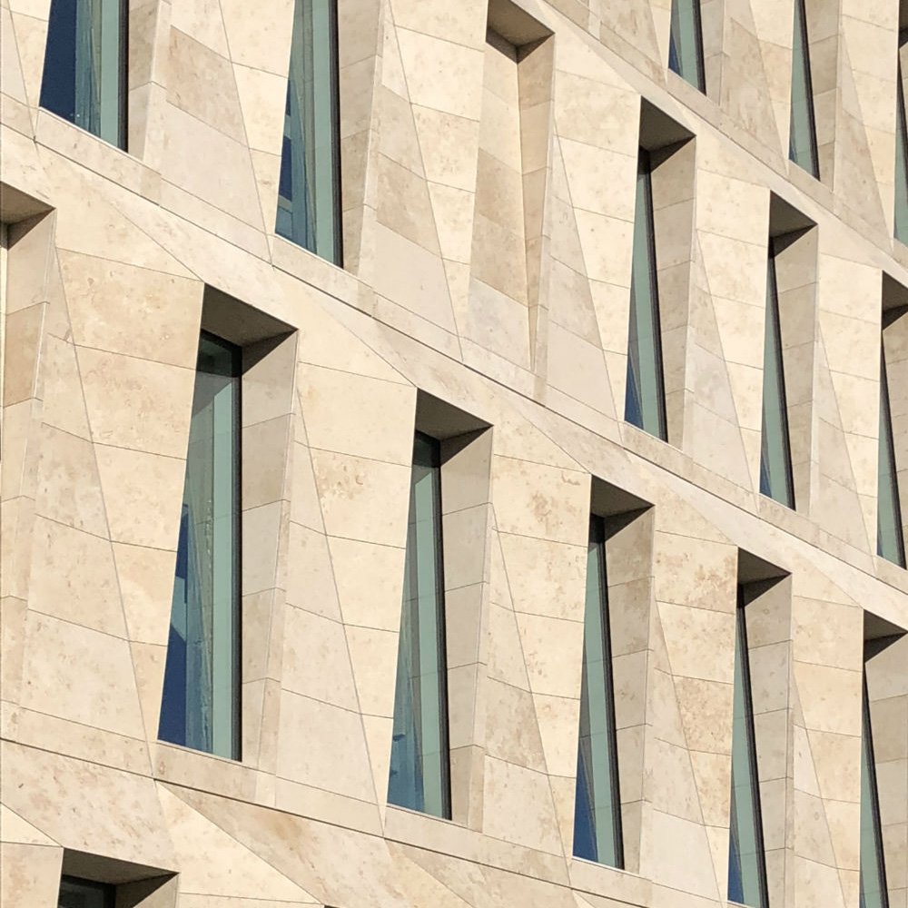 Facaden er en kompleks tredimensionel facade, som yderst er beklædt med naturstensbeklædning ”Jura Gelp”