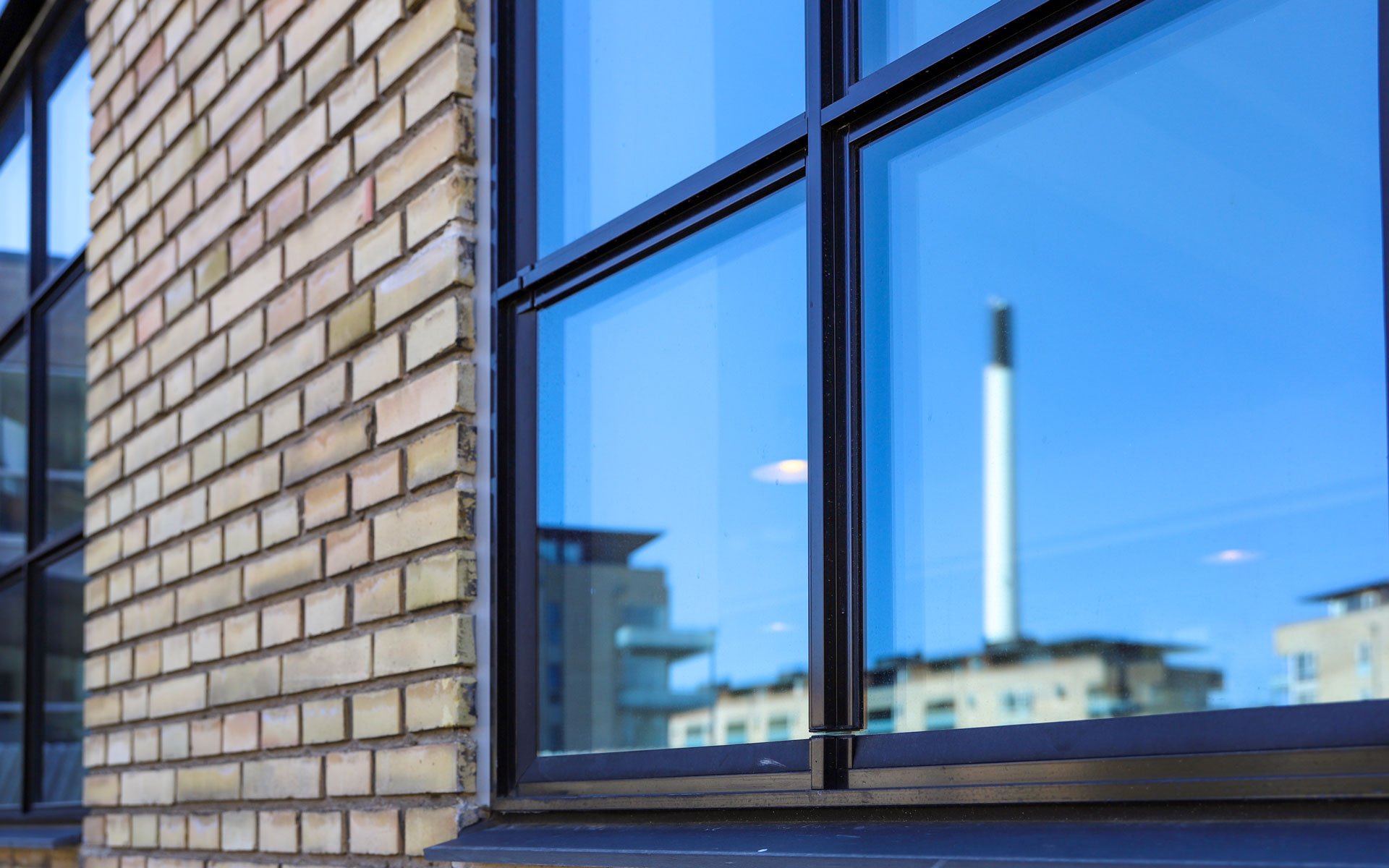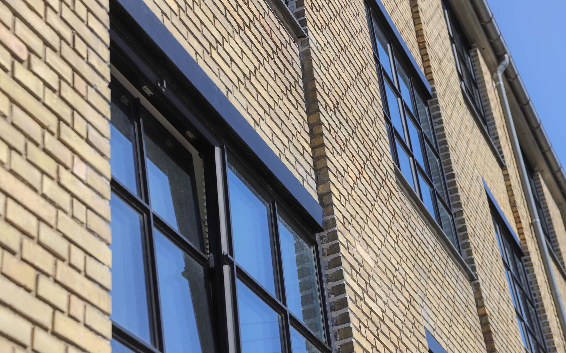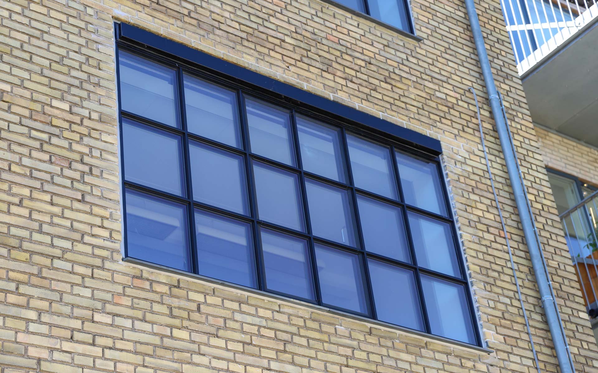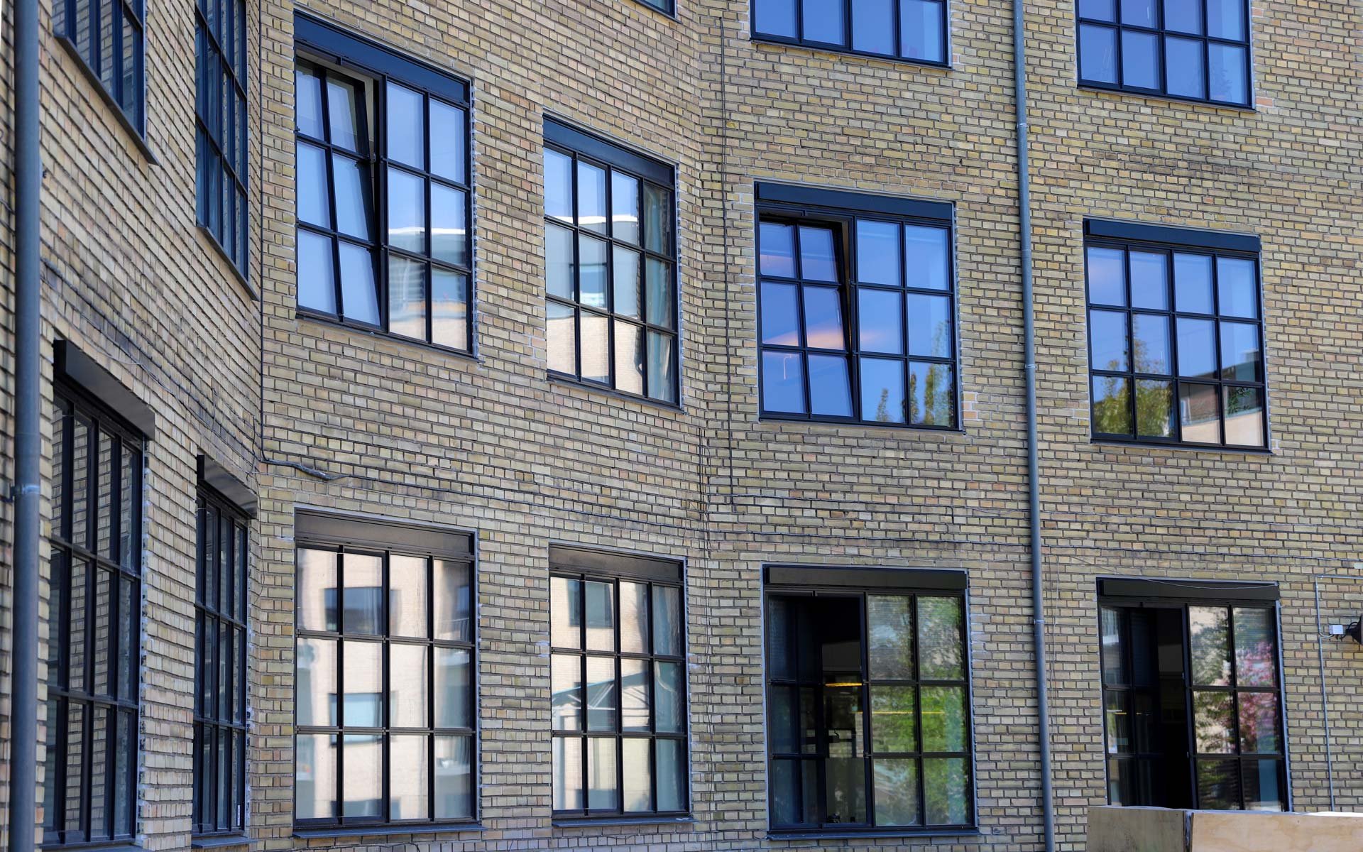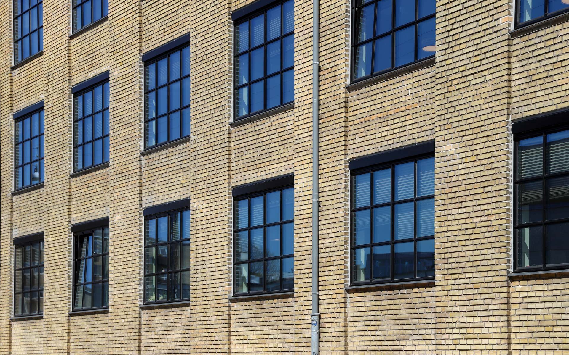 Sålbænkene under vinduespartierne er udført i sort skifer, som er et naturligt og langtidsholdbart materiale, som fuldender det æstetiske og industrielle udtryk i kombination med smalle sprosser og rammer.