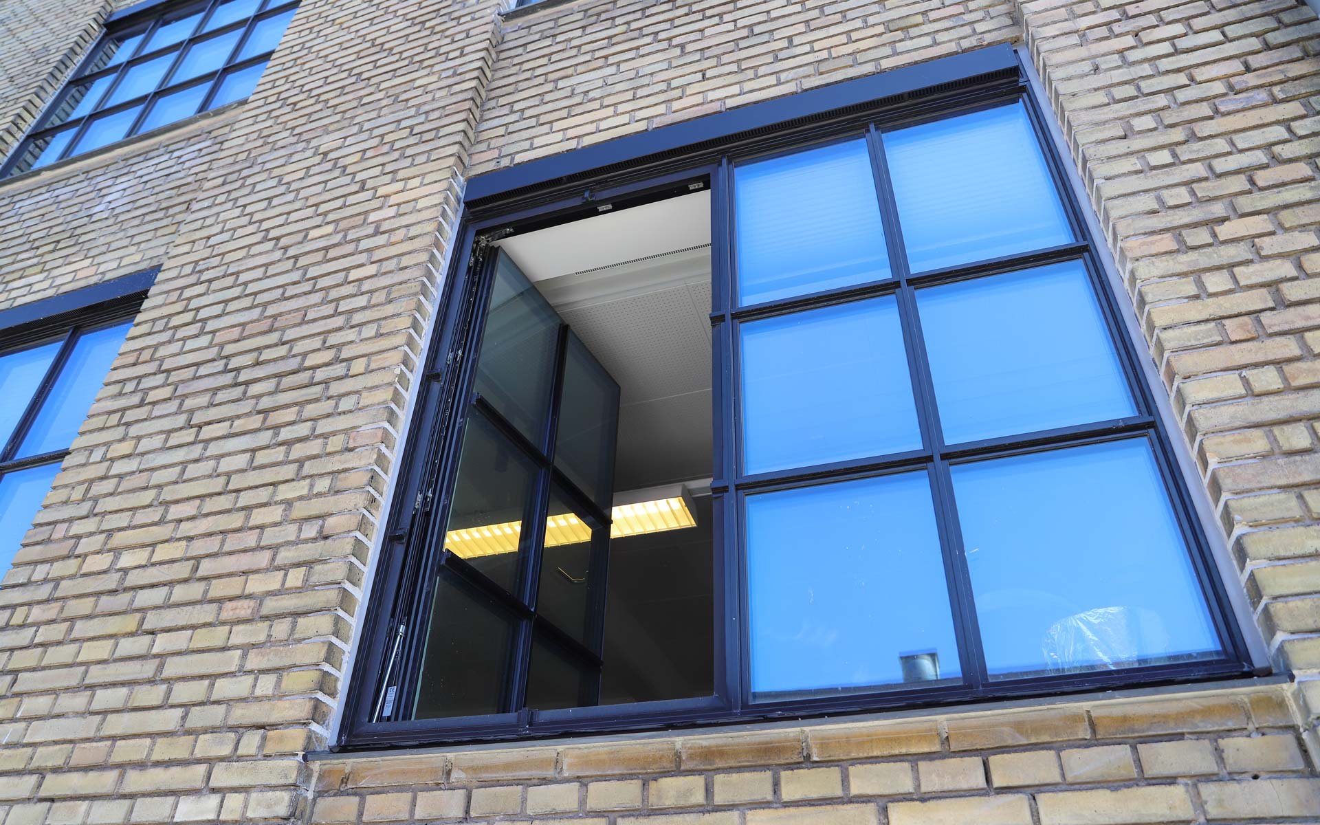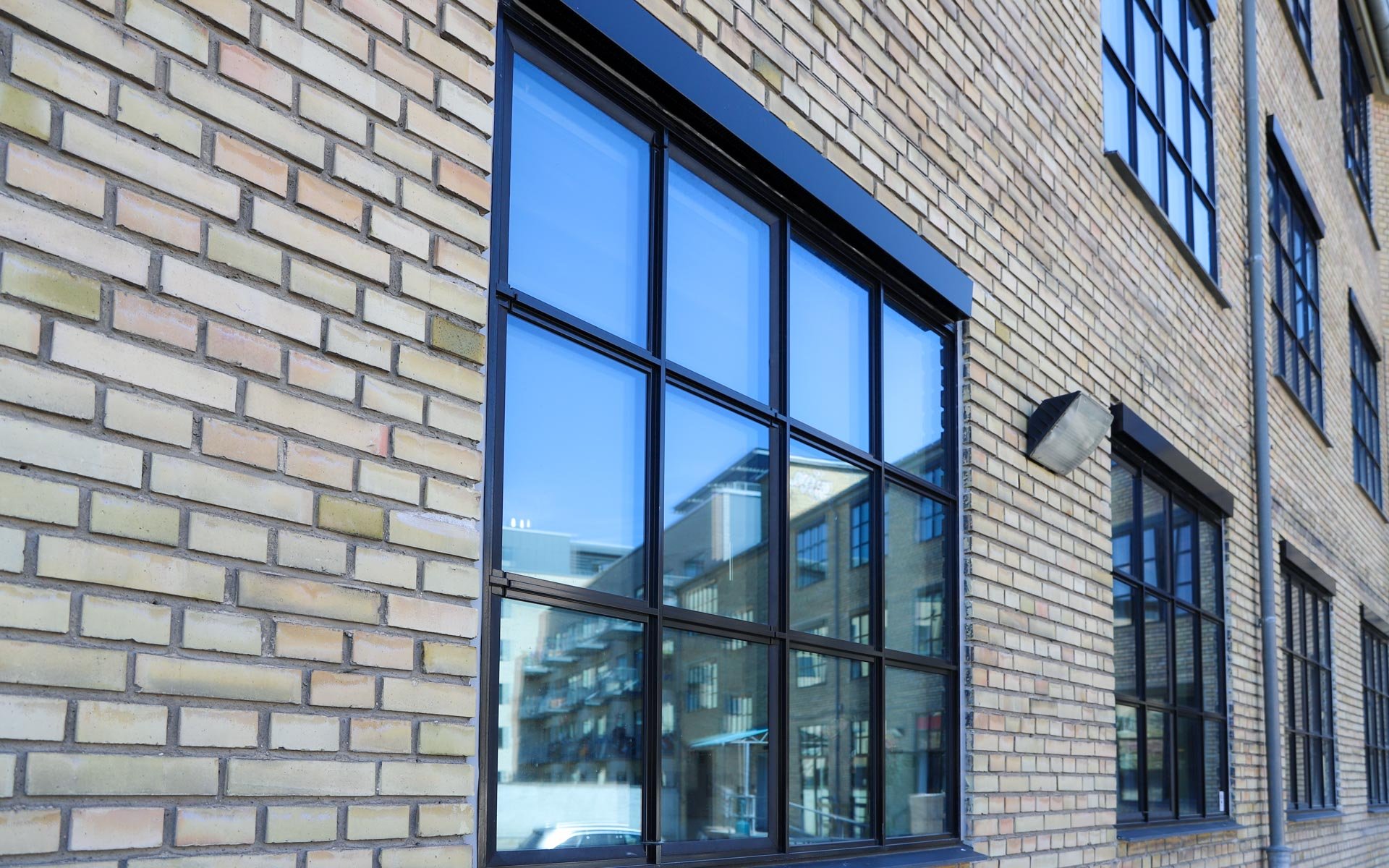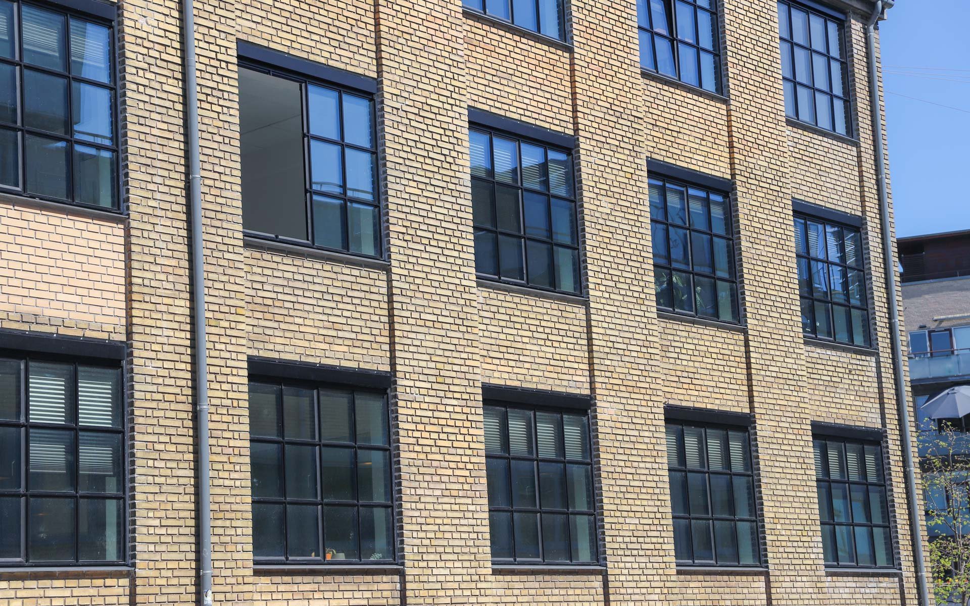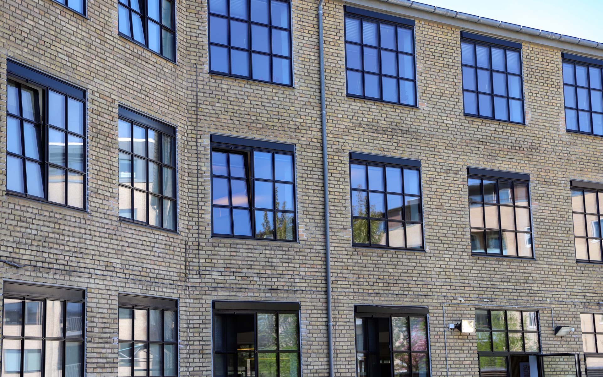 Sålbænkene under vinduespartierne er udført i sort skifer, som er et naturligt og langtidsholdbart materiale, som fuldender det æstetiske og industrielle udtryk i kombination med smalle sprosser og rammer.
