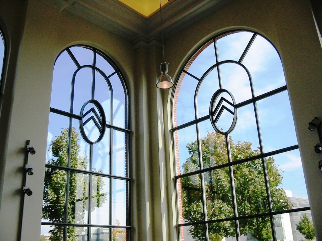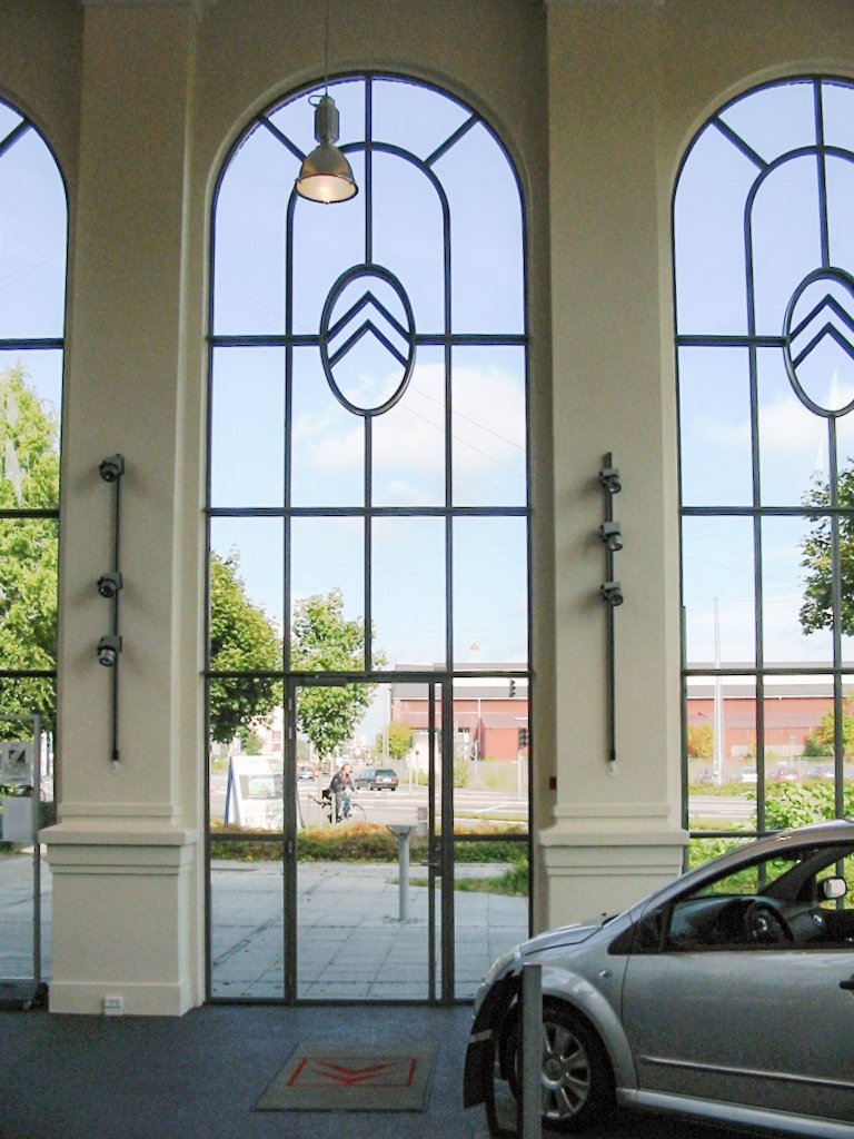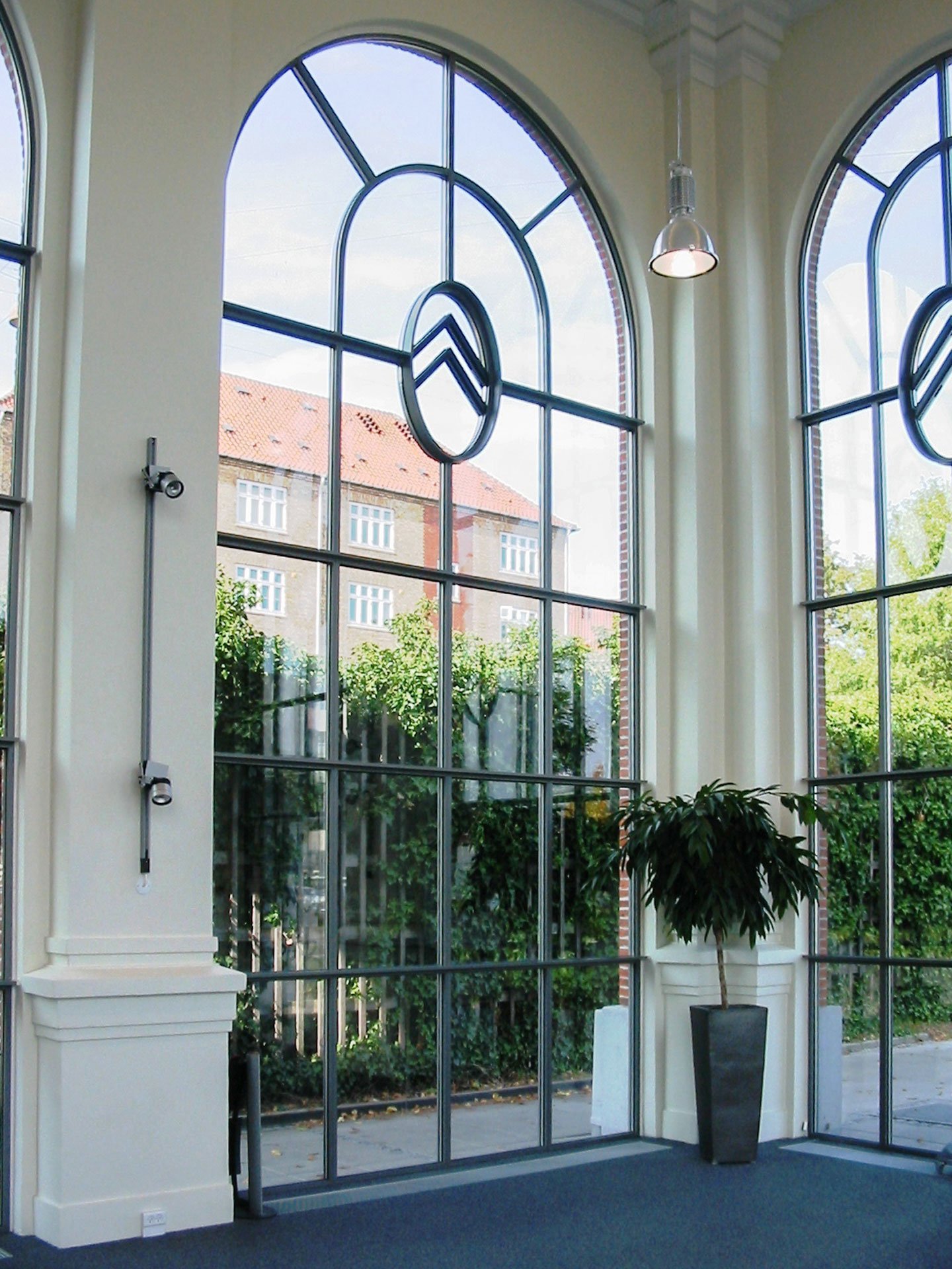 Med de valsede partier og logo udført i sprosseringen, er det renoveringen med respekt for fortiden og de arkitektoniske vision der lå til grund for byggeriet for små 100 år siden.