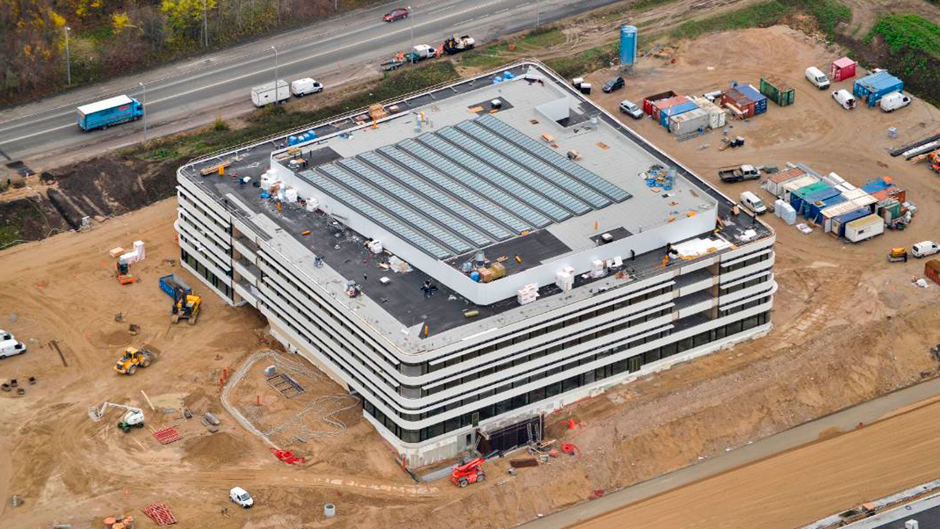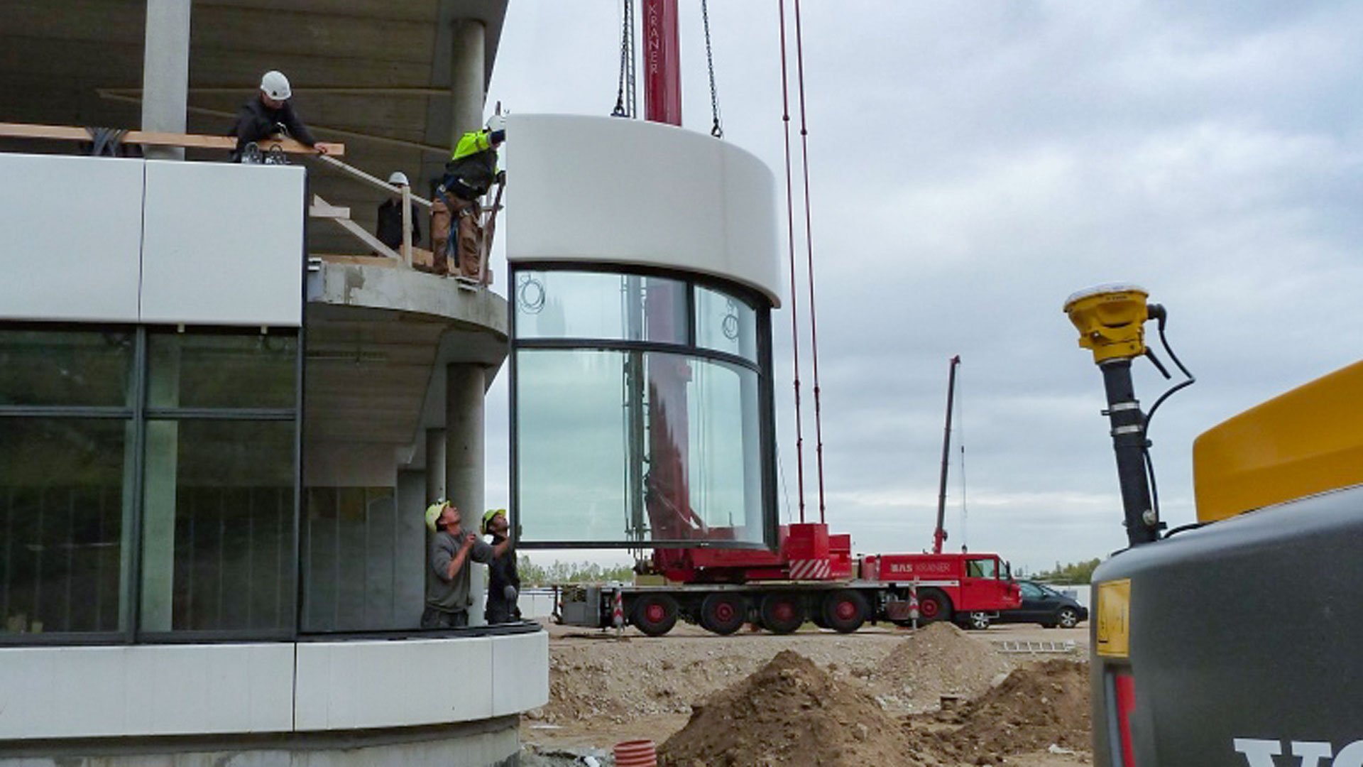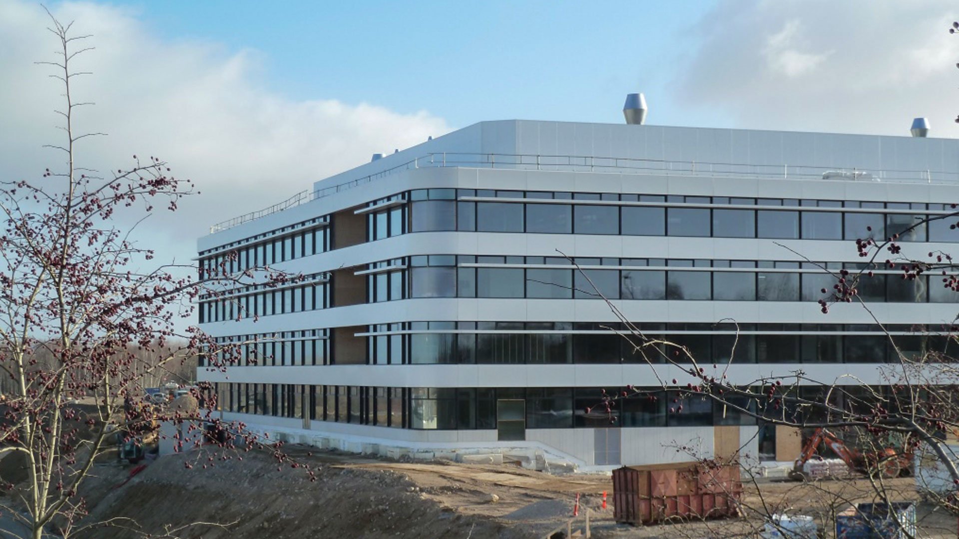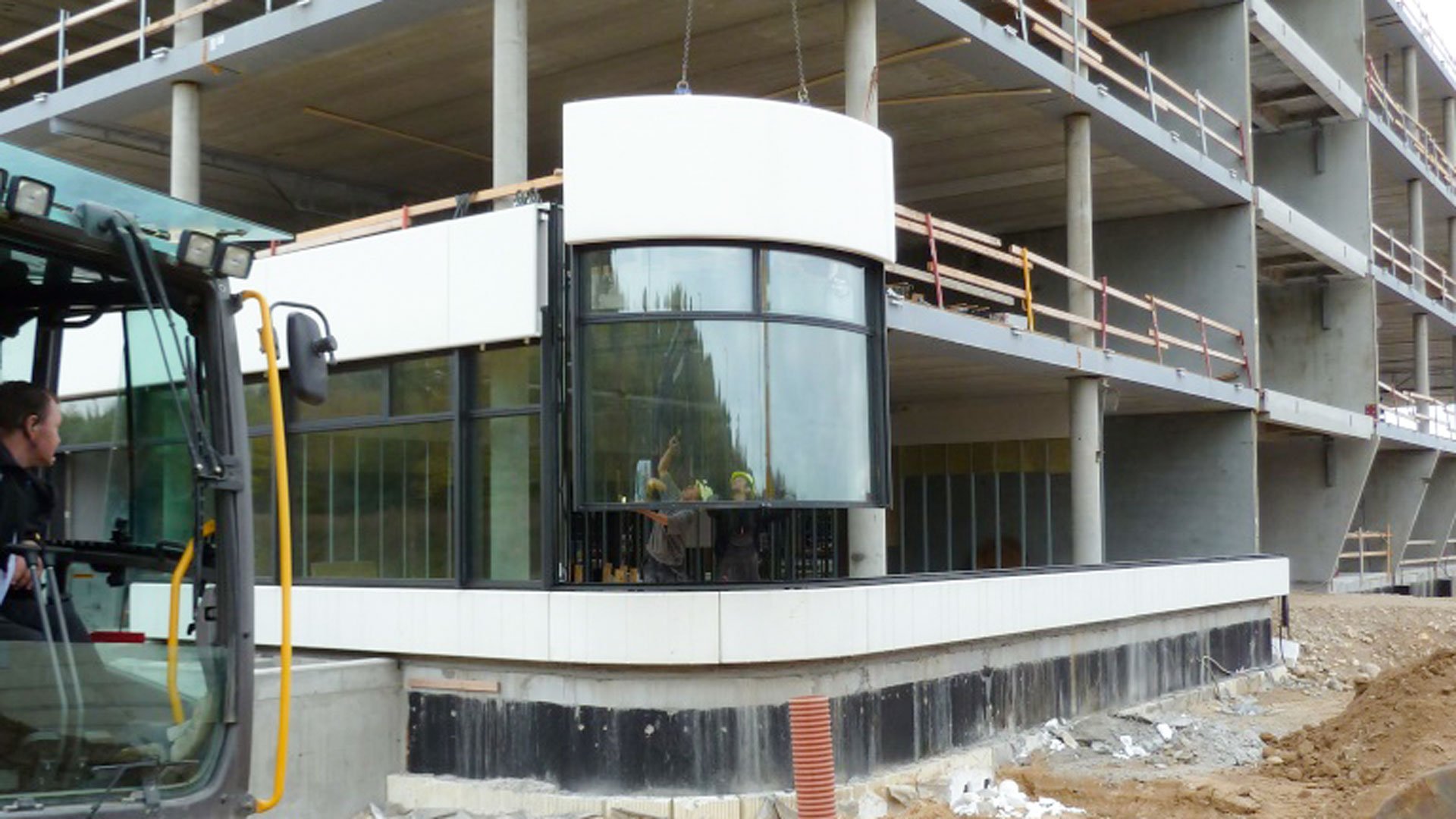 De præfabrikerede elementer inkluderer hjørner med cylinderbøjet glas,kassettebeklædning, vandret Hansen Solskærm og integreret persienneløsning.