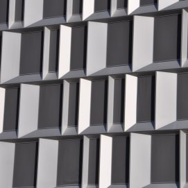 Facaden er udført i 100% præfabrikerede moduler i systemet HansenUnitAl, der sikrer en væsentlig kortere byggetid på pladsen og rekordhurtig lukning af huset.