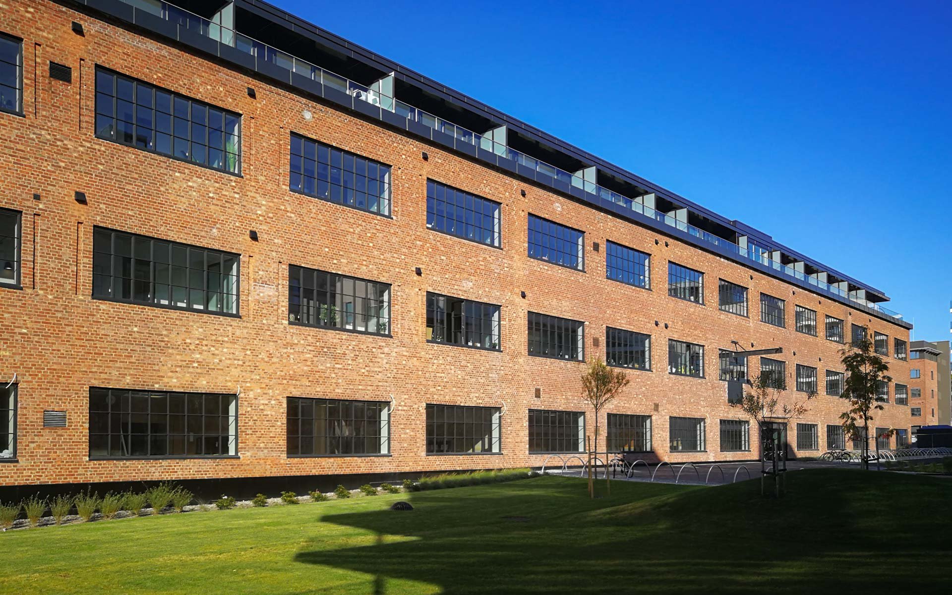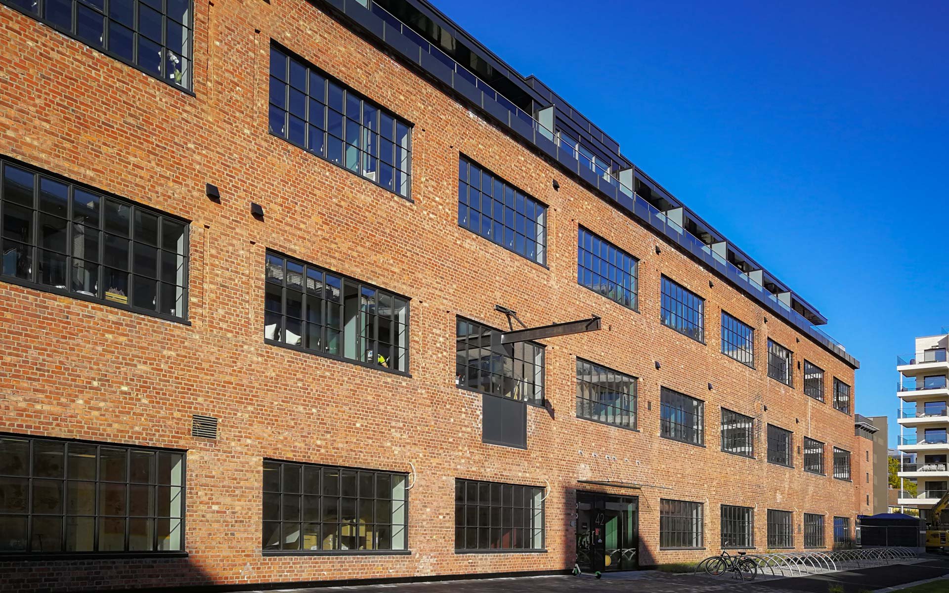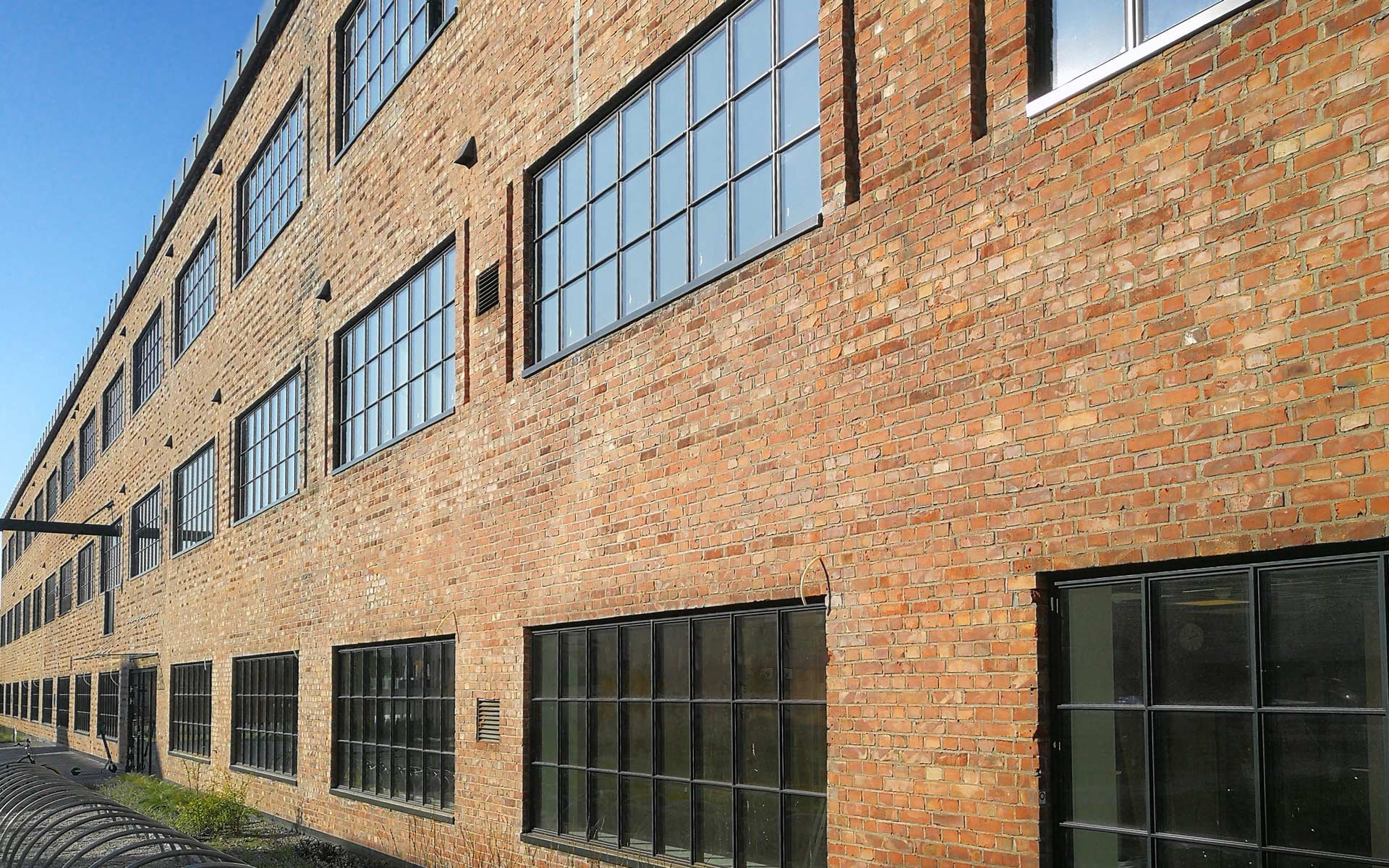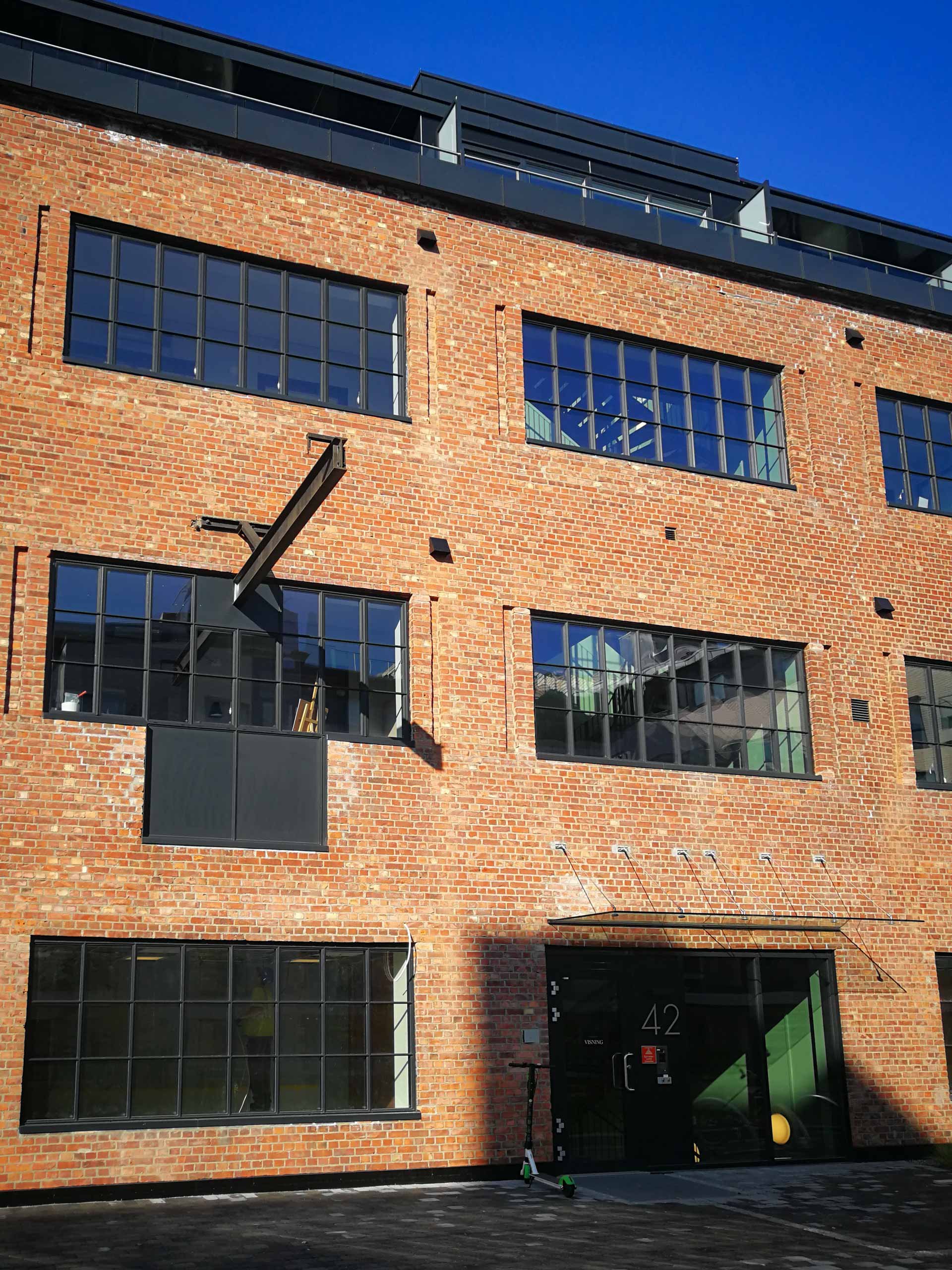 Det er de gamle industrilokaler til Bryn-Halderns & Nitedals Tændstikfabrik fra 1938, som i forbindelse med renovering er blevet transformeret til moderne boliger i tre etager og undervisningslokaler i stueplan.