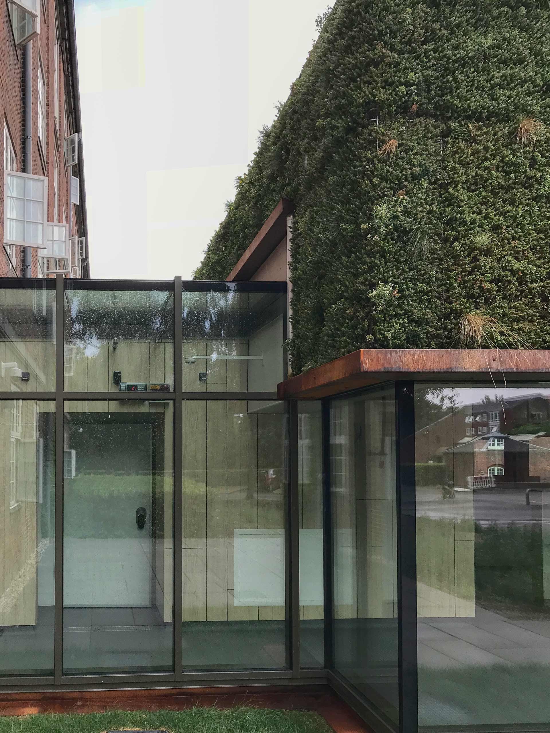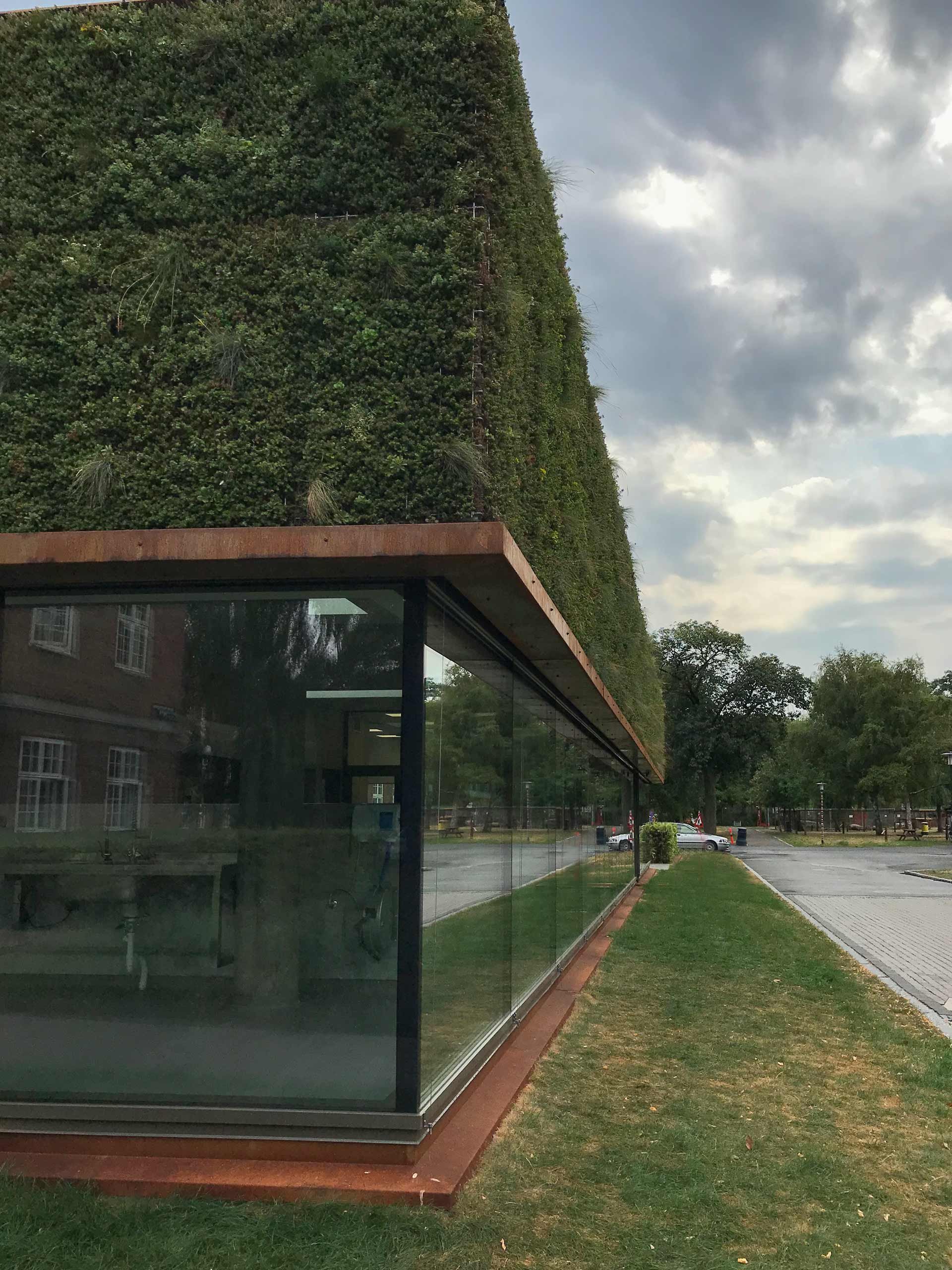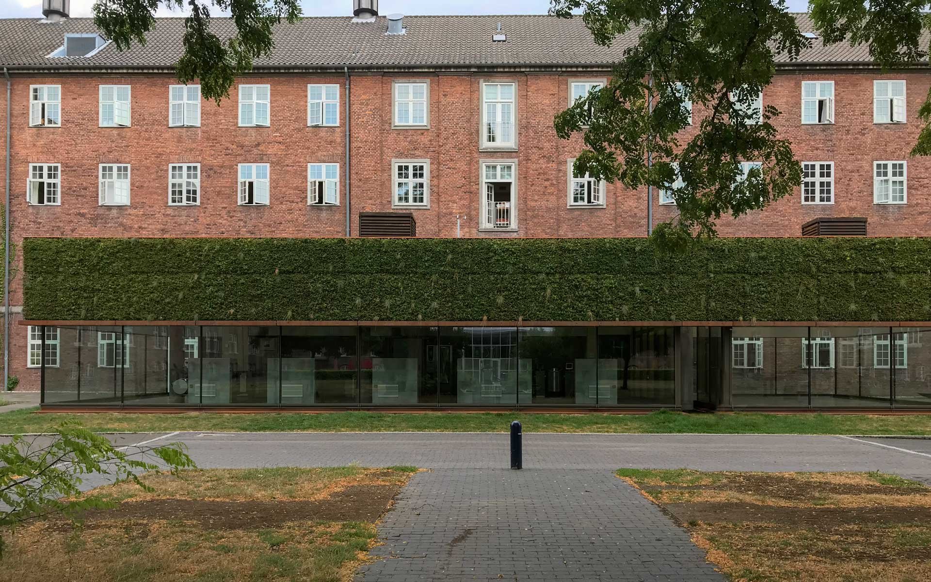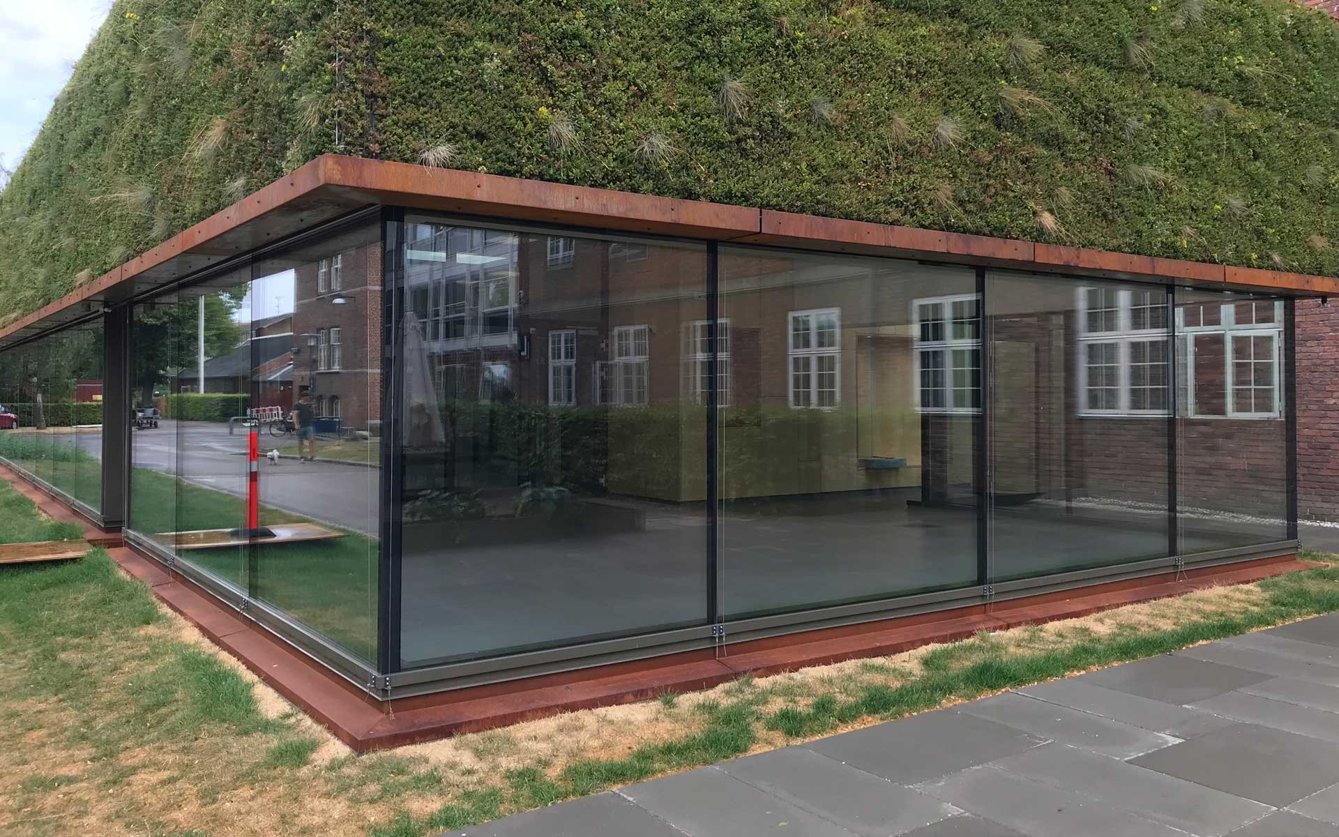 Sammen med det grønne tag danner facaden klimaskærmen for den nye tilbygning.