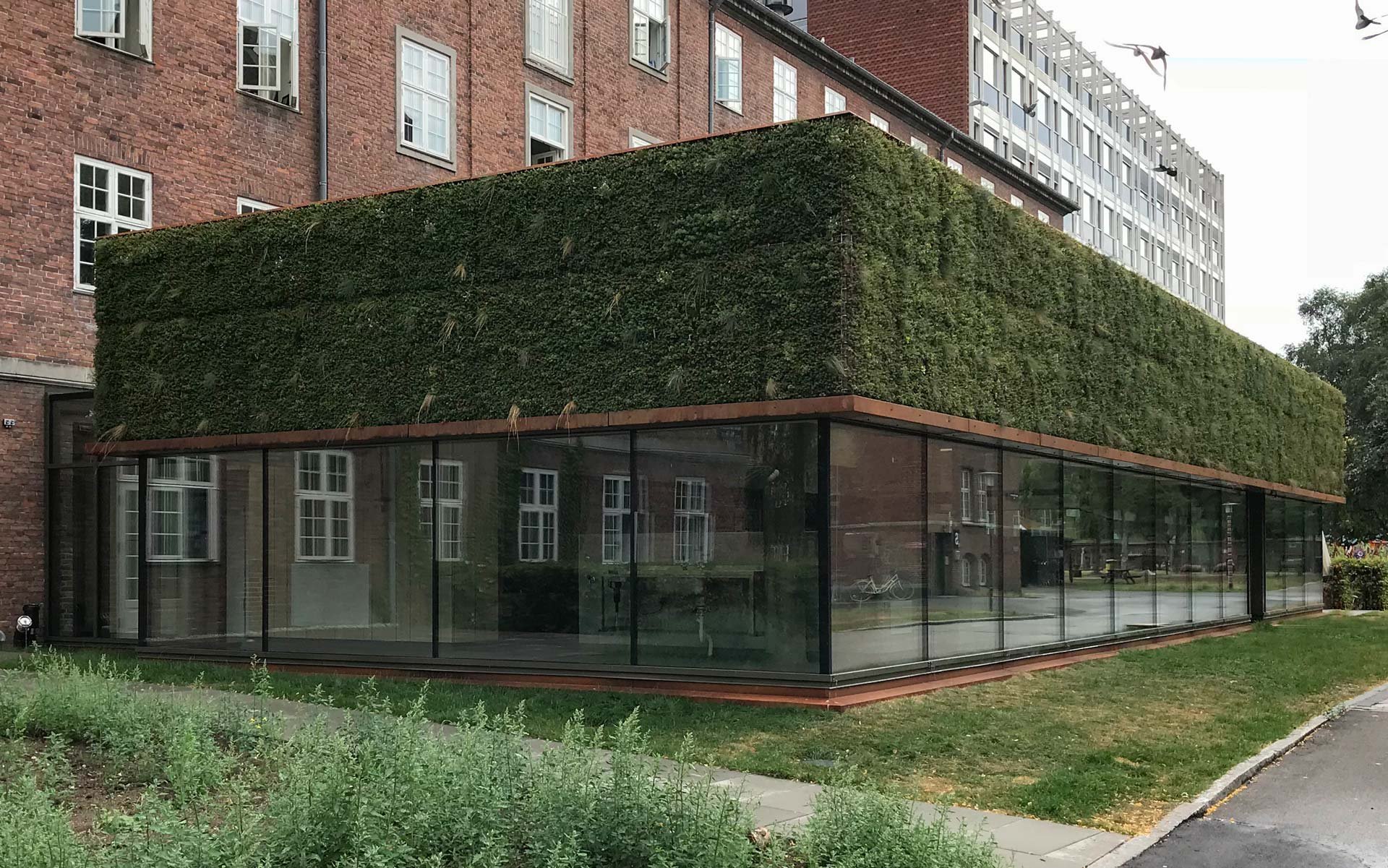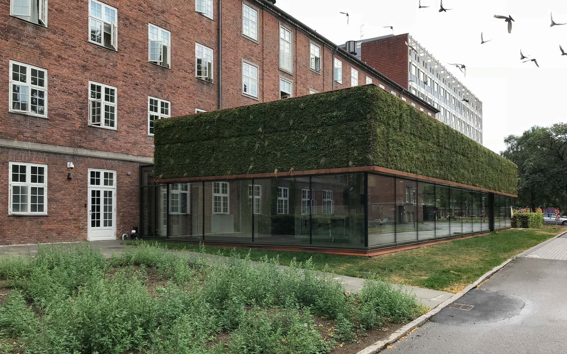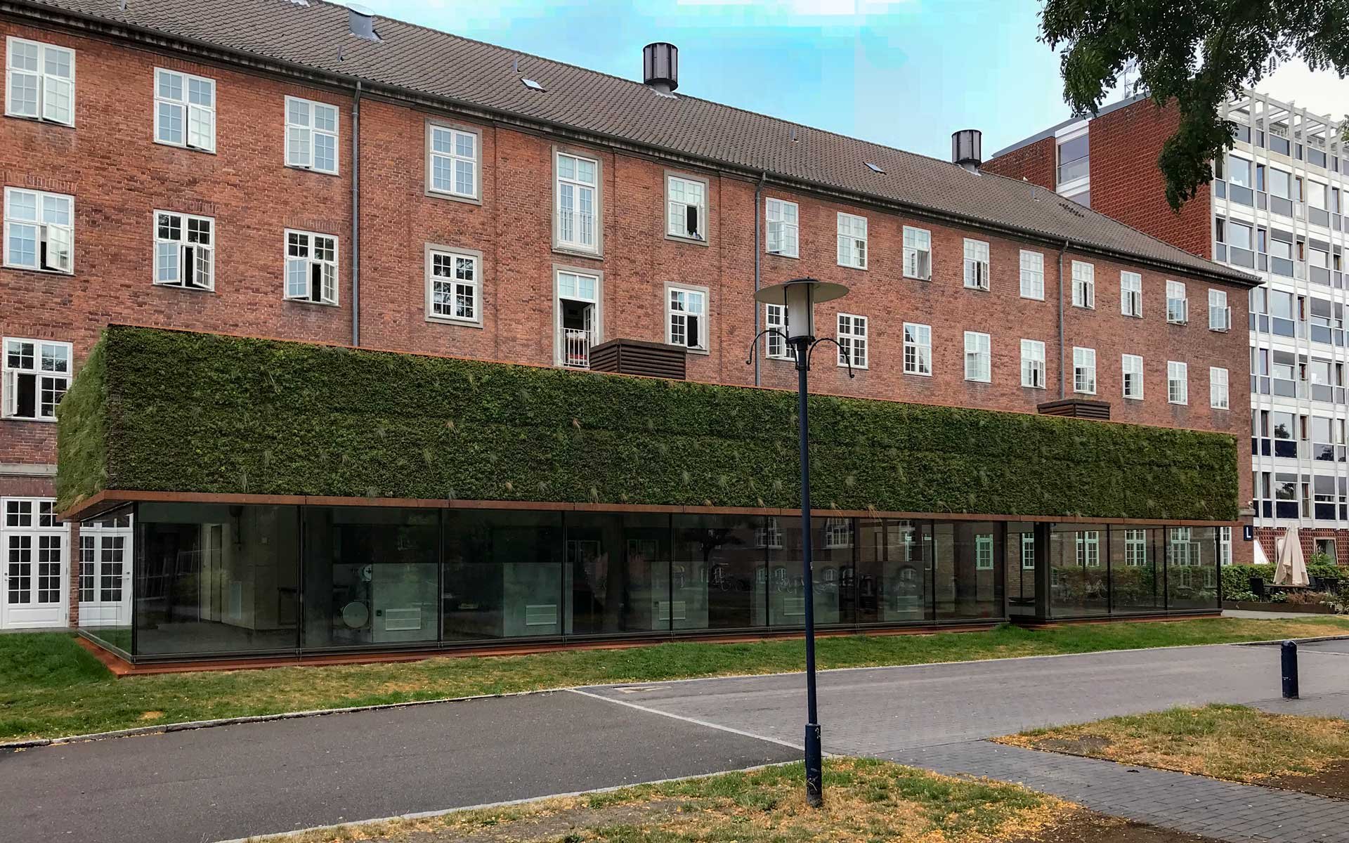 Sammen med det grønne tag danner facaden klimaskærmen for den nye tilbygning.