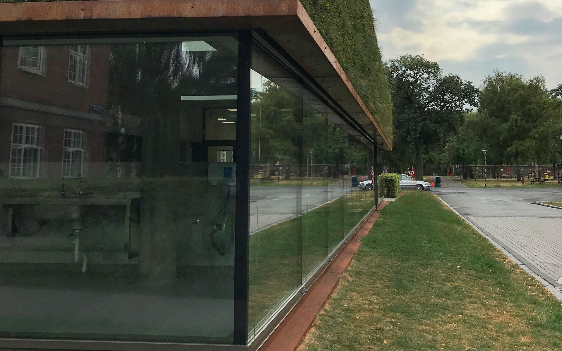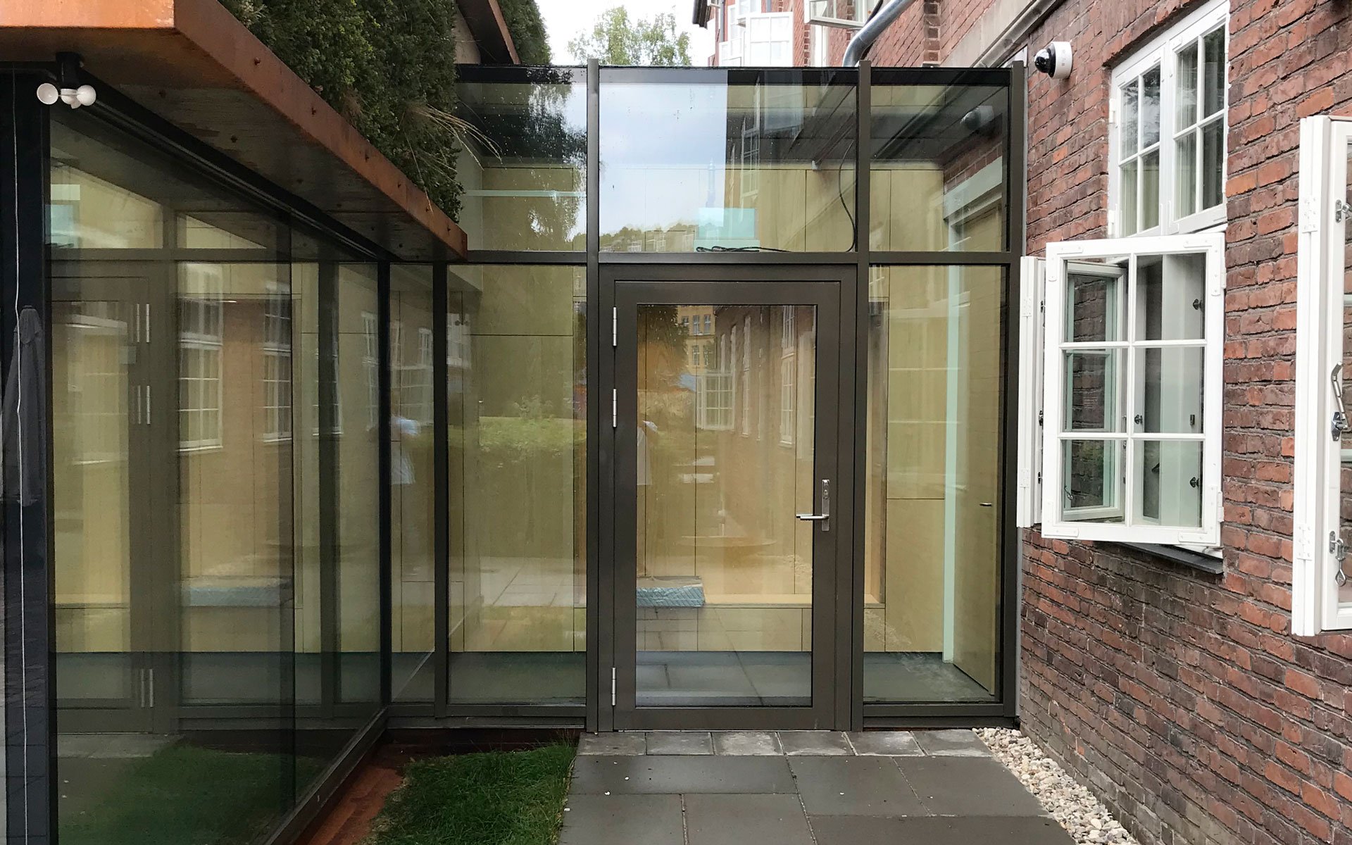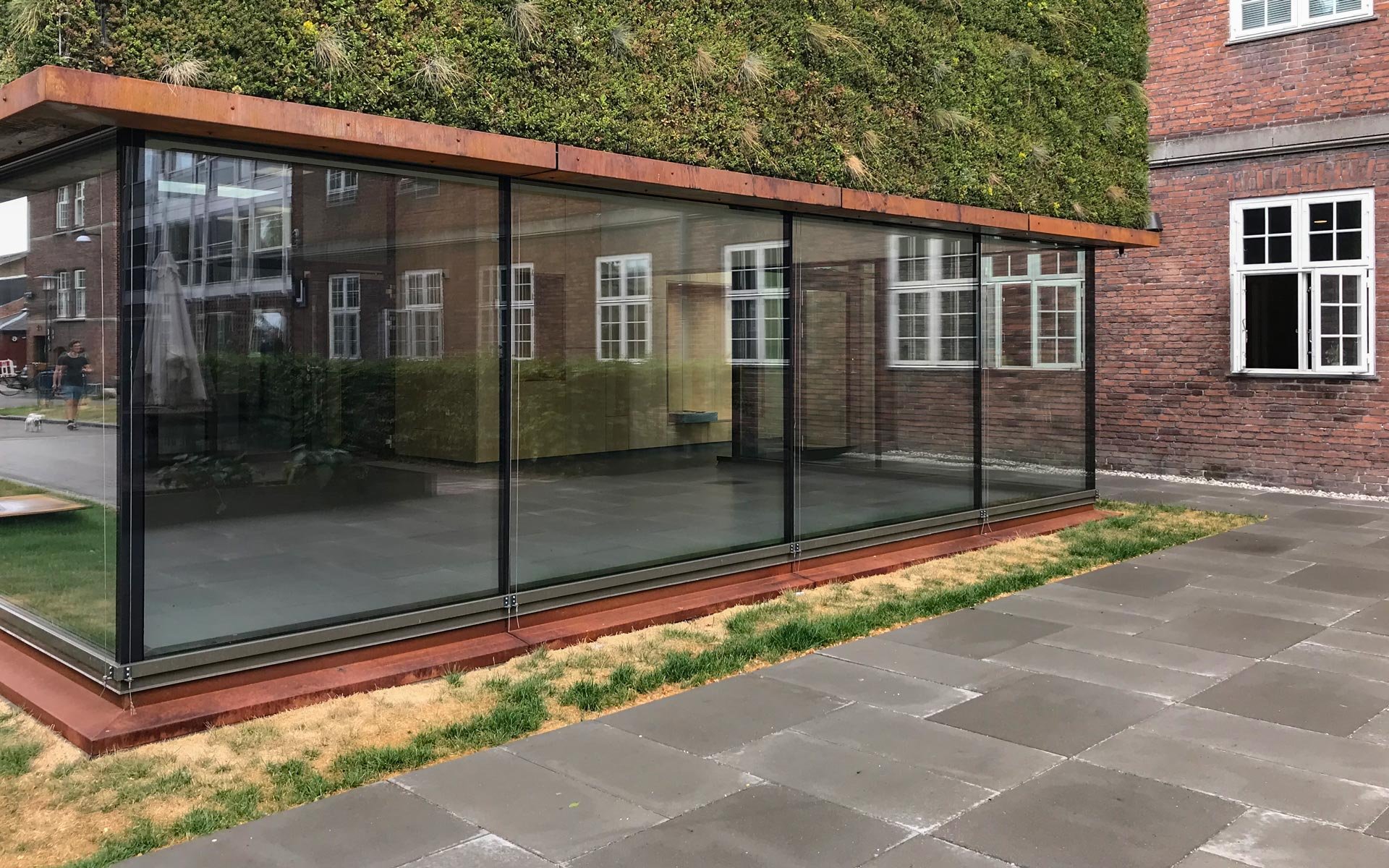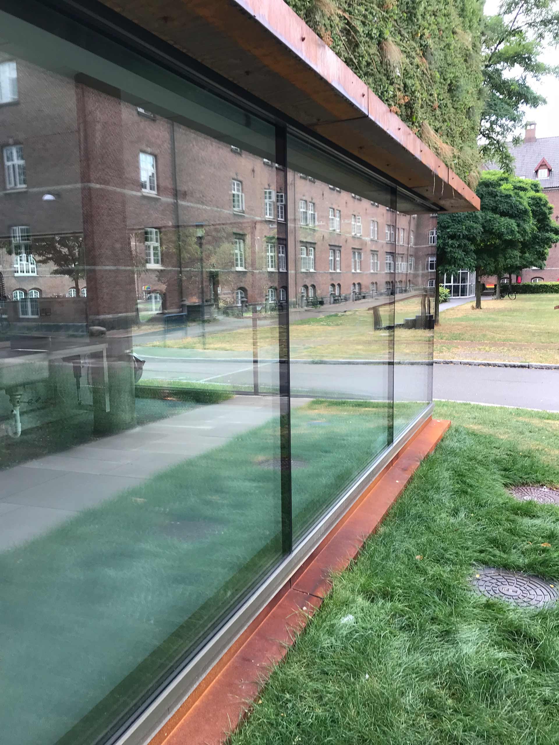 Sammen med det grønne tag danner facaden klimaskærmen for den nye tilbygning.