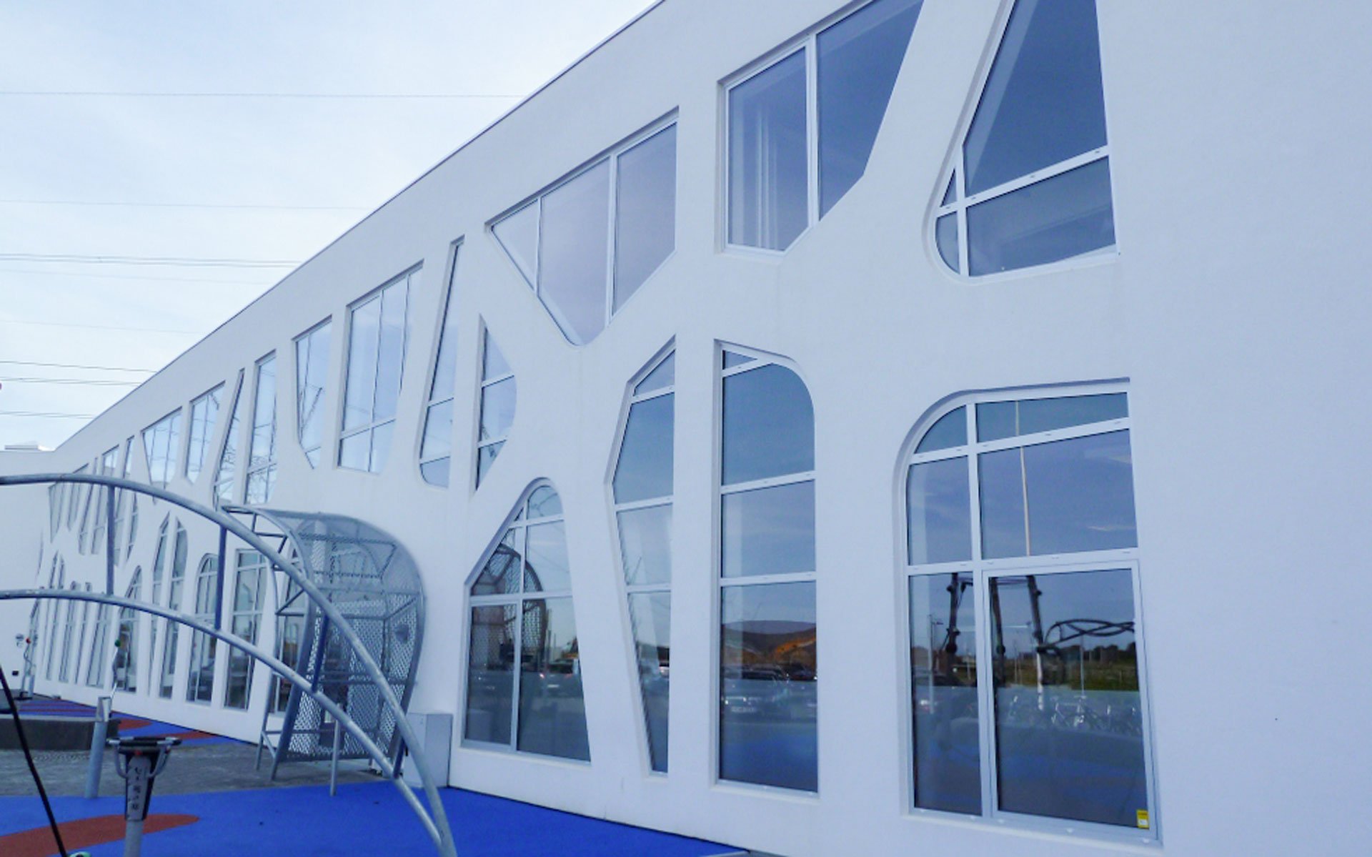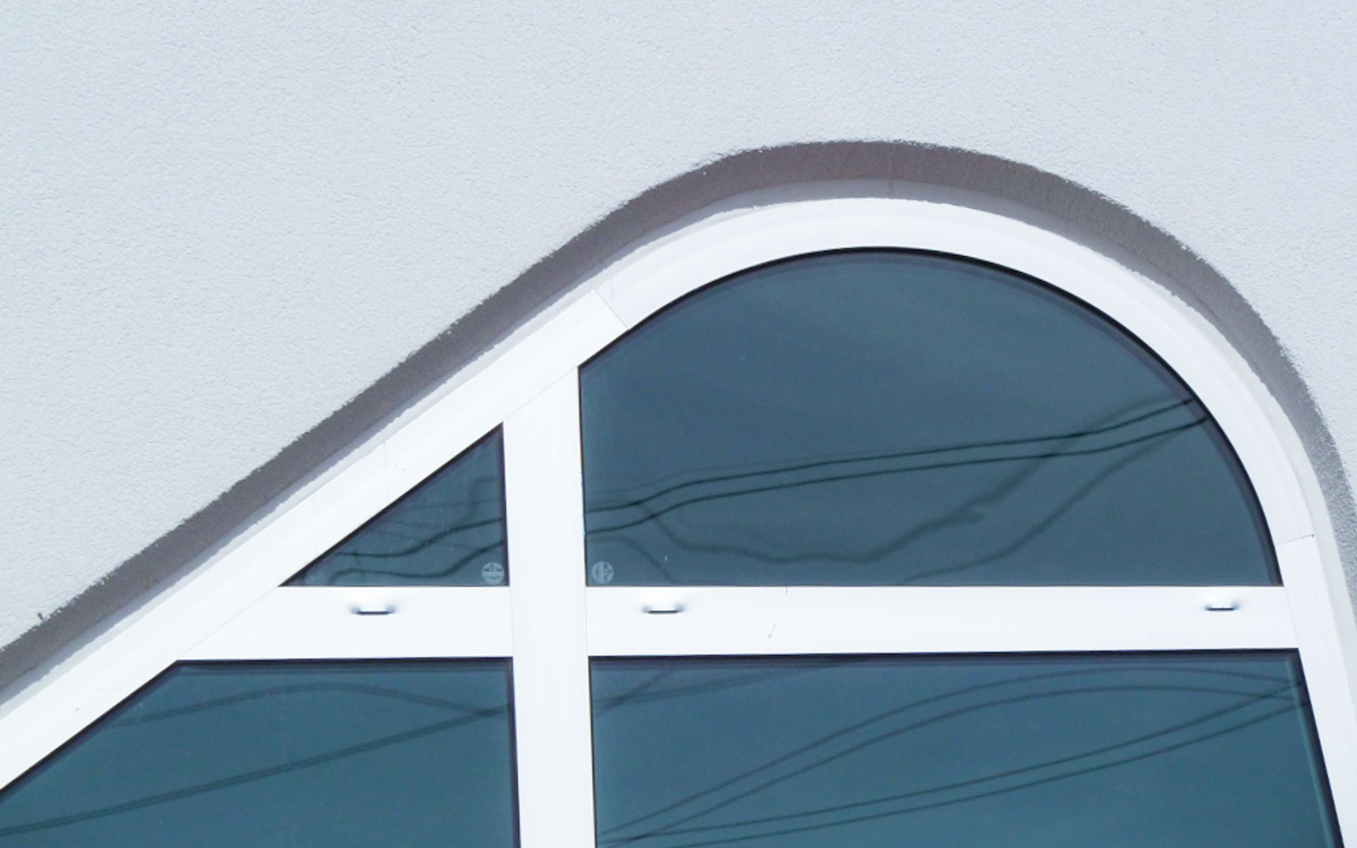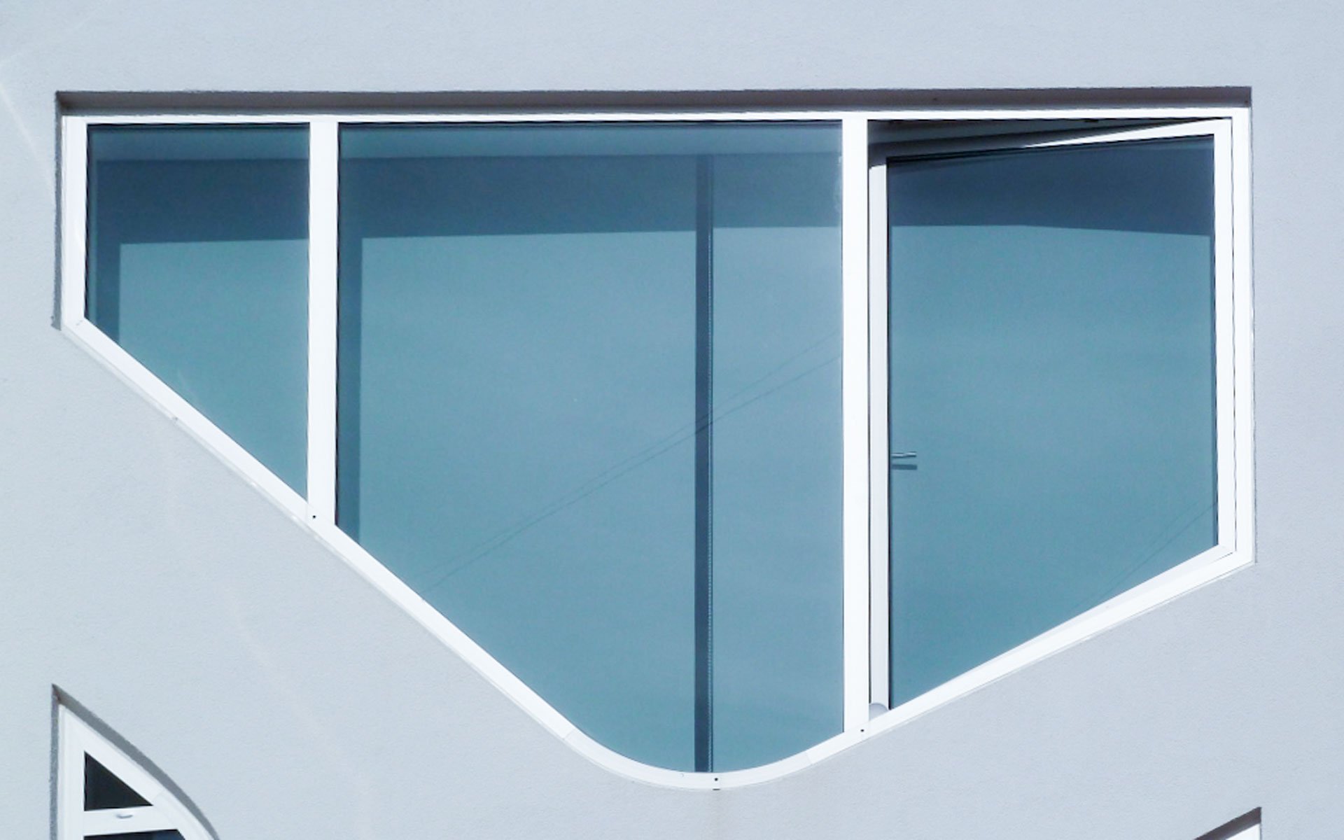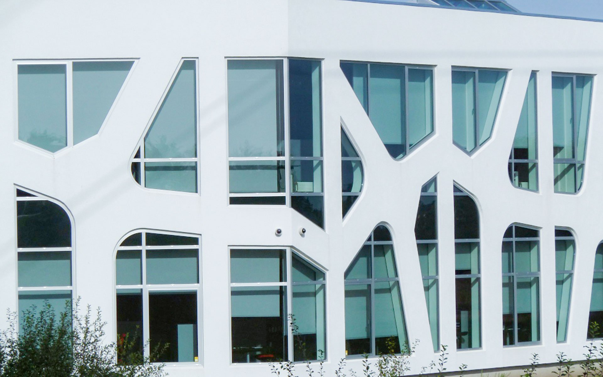 De buede og kantede vinduer skaber et modspil til den ellers kasseformede bygning.
