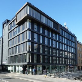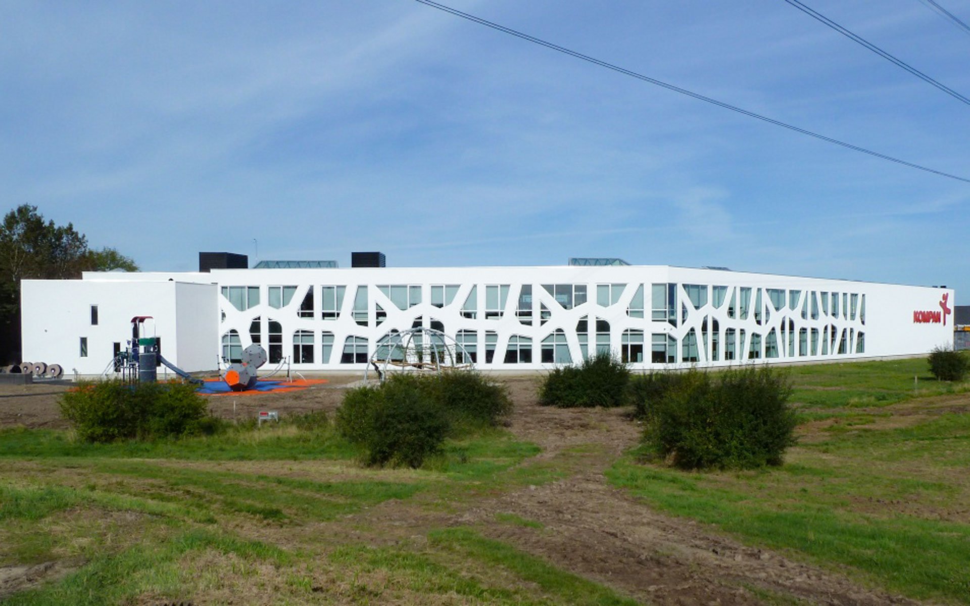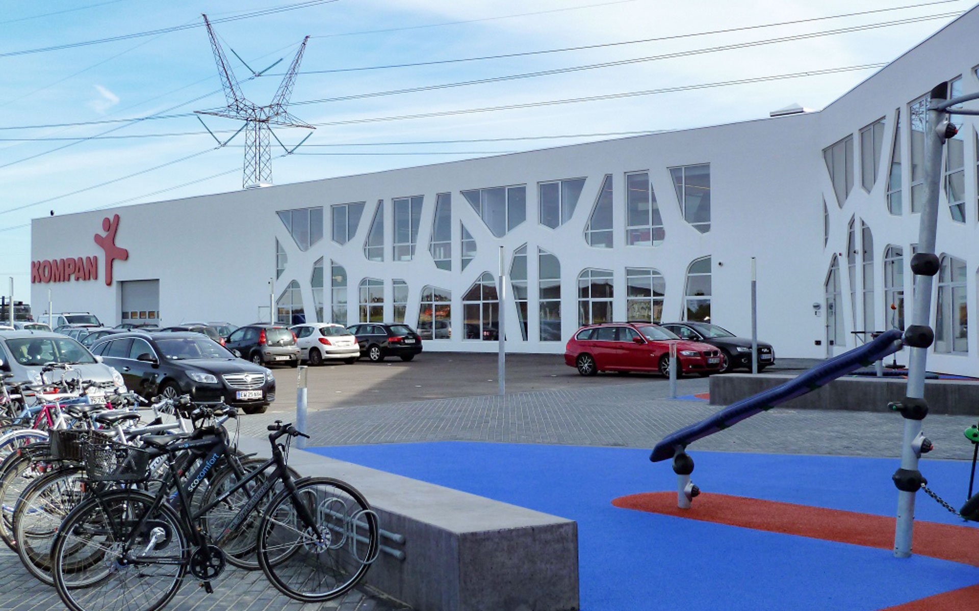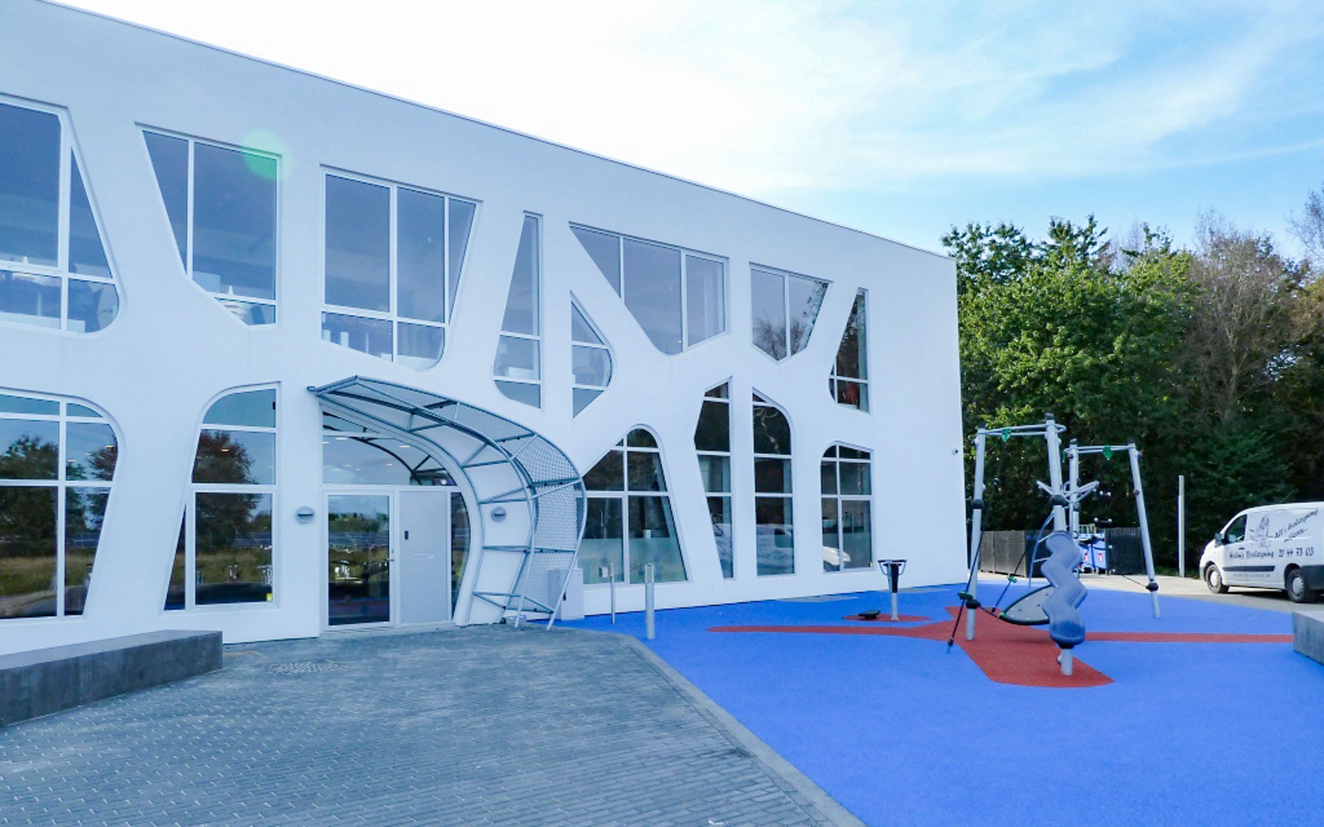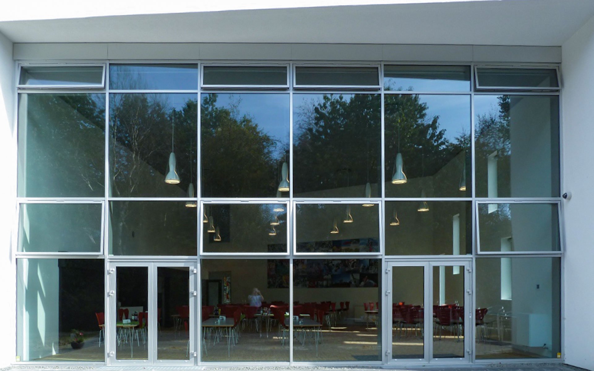 De buede og kantede vinduer skaber et modspil til den ellers kasseformede bygning.