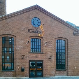 Midt i det hele en stor firkantet facade forsat i forhold til den øvrige facade med motorstyret, tophængt og udadgående opluk.