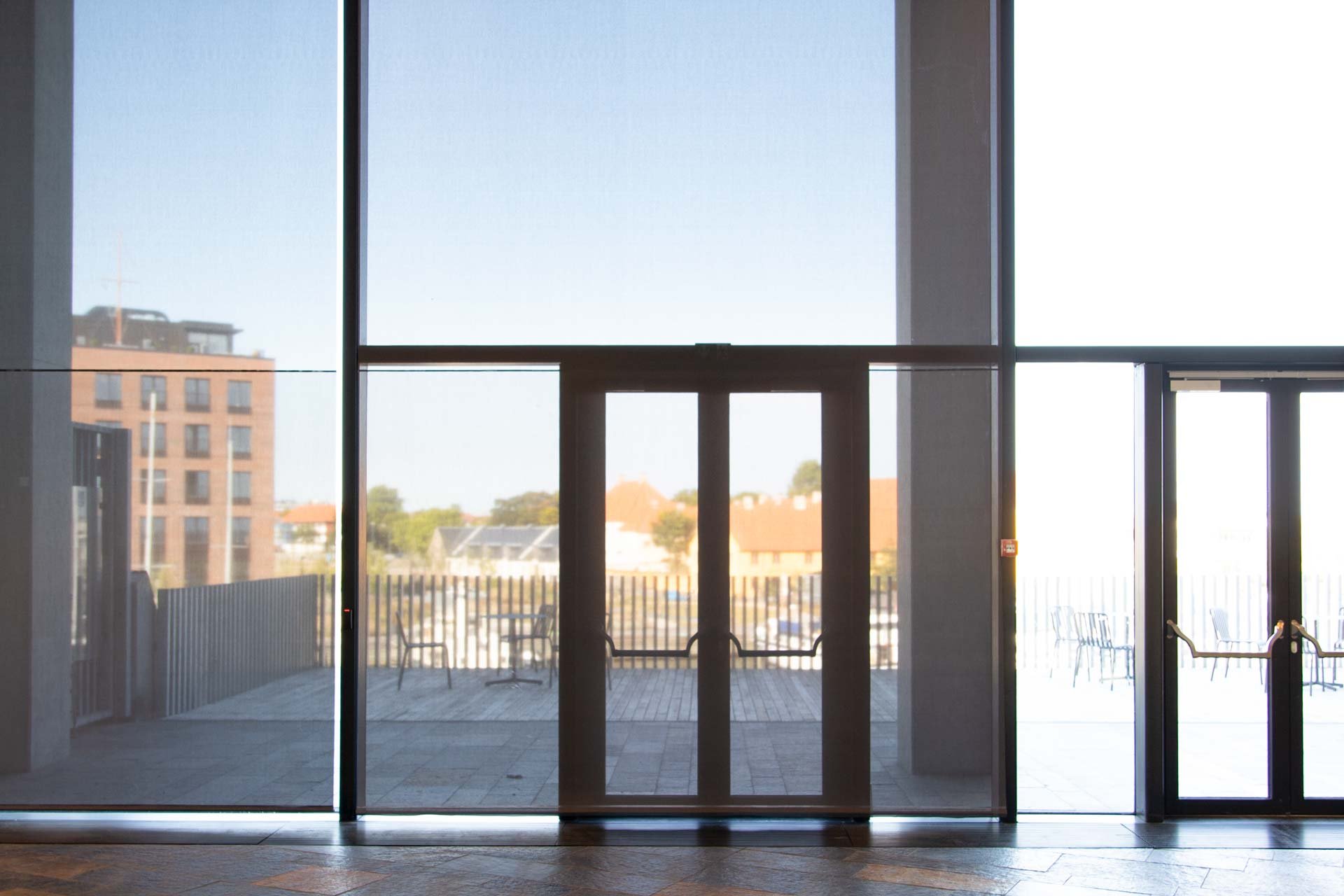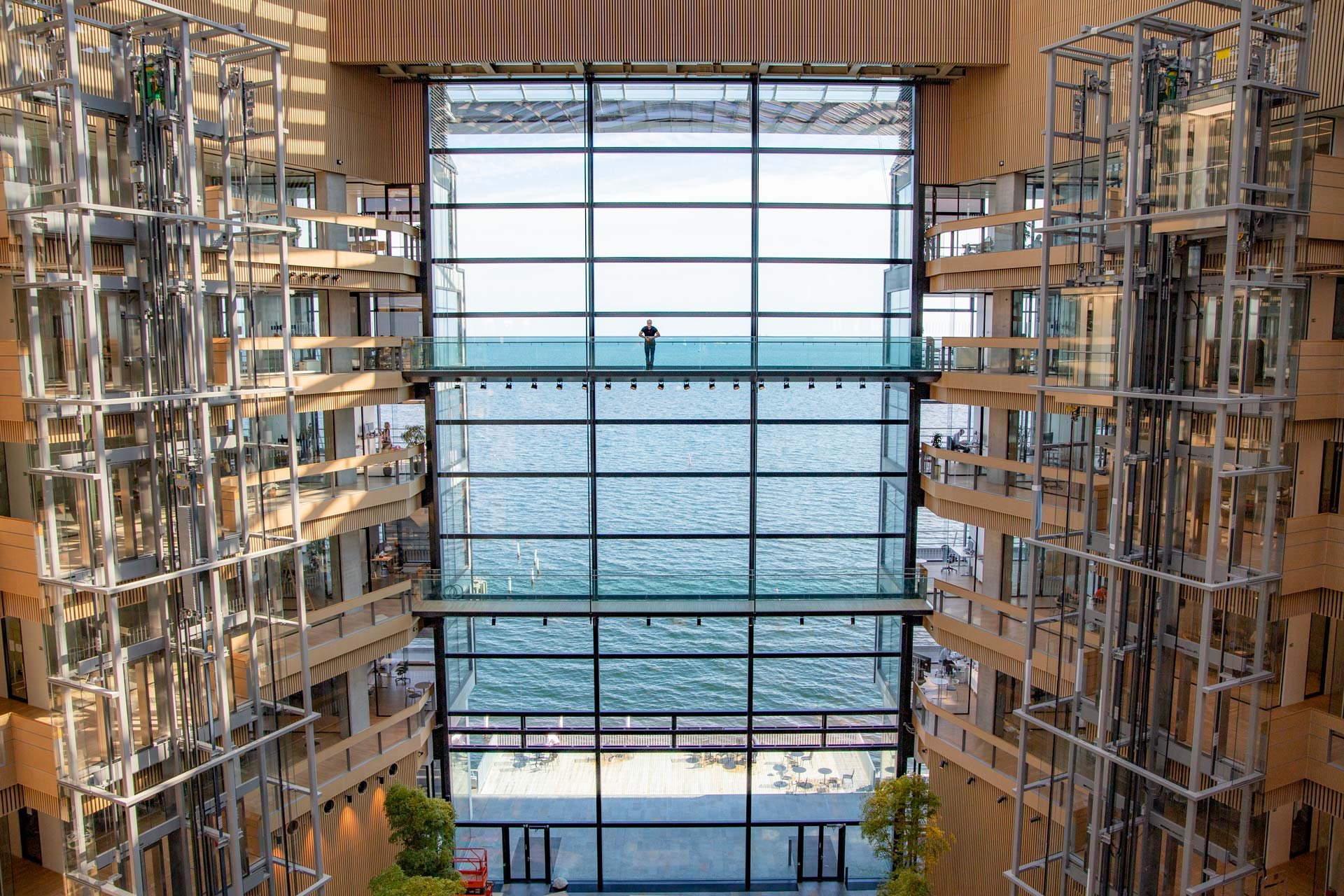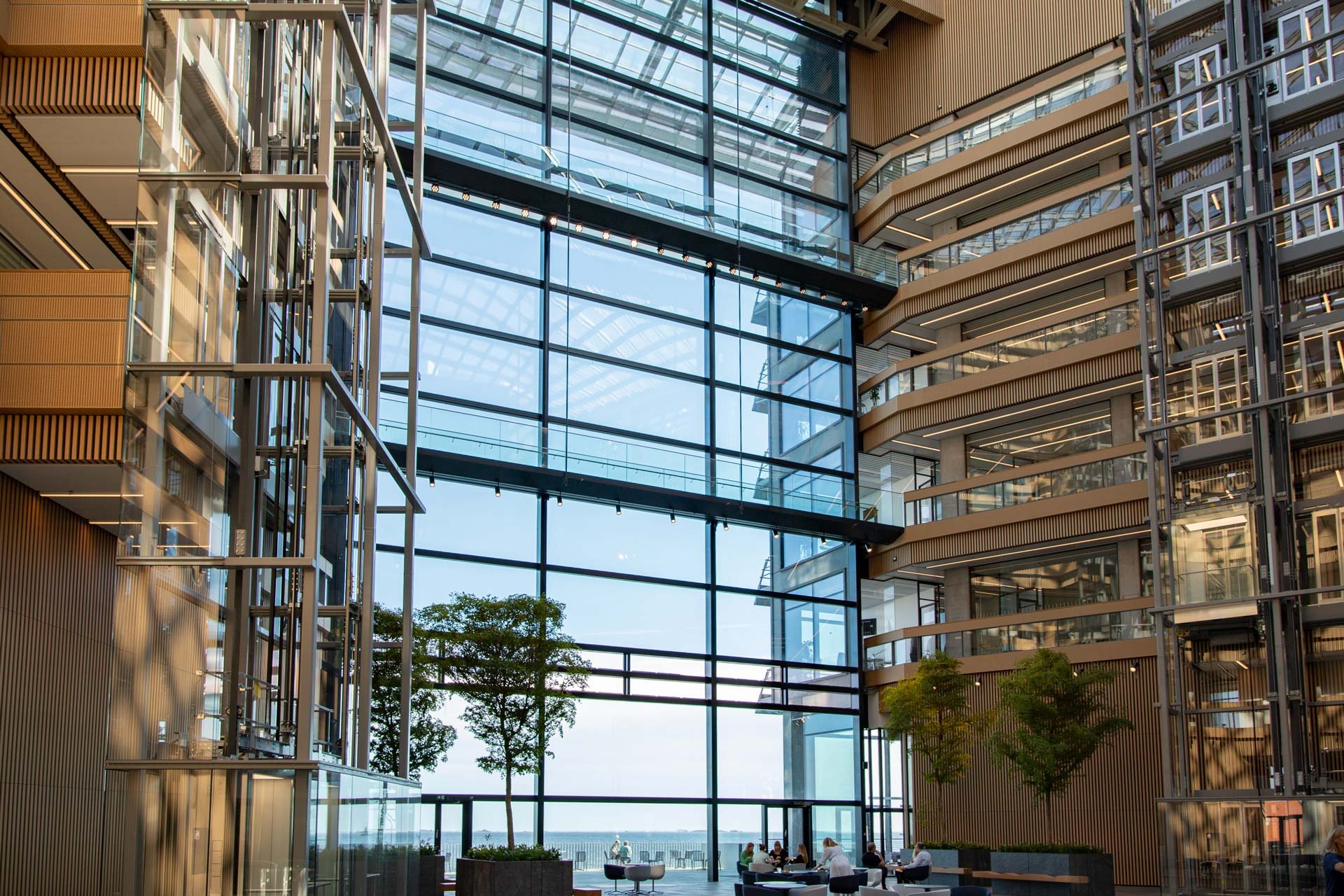 Tag nu det voluminøse panoramavindue ud mod Øresund, der strækker sig fra atriumgulvet og seks etager op til det hvælvede glastag. Det er på 630 kvadratmeter, der skal kunne holde til det store vindtryk fra havet.
