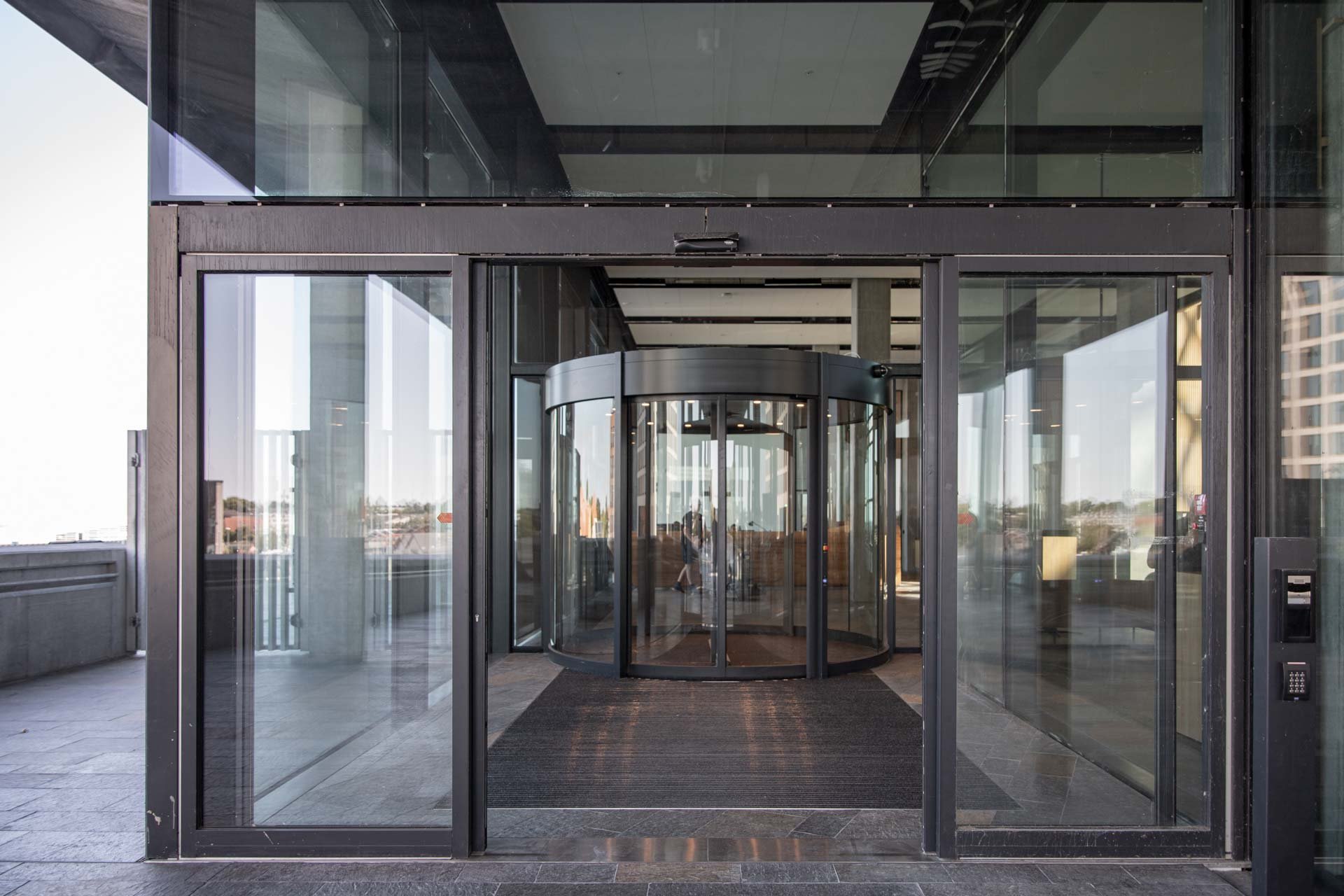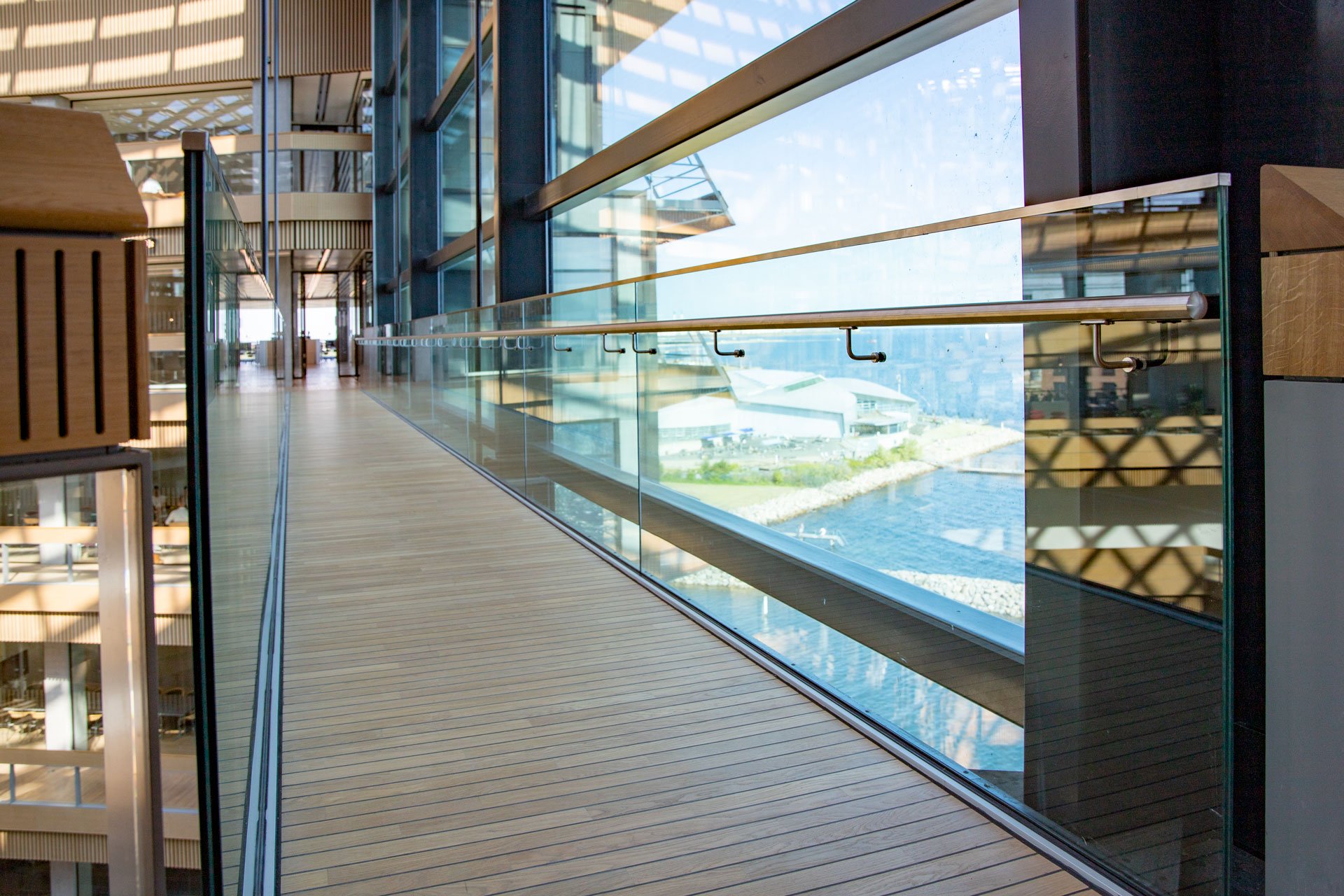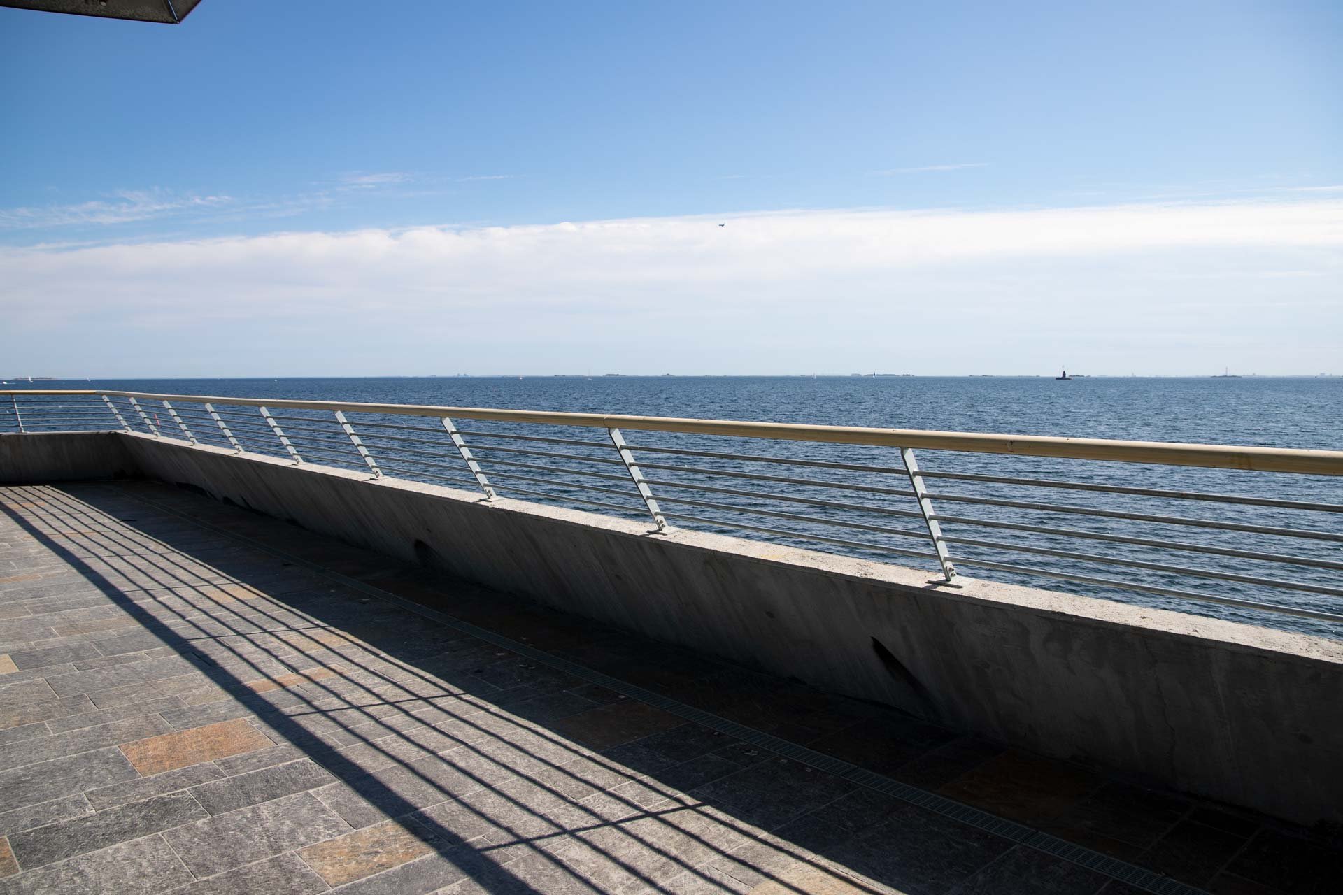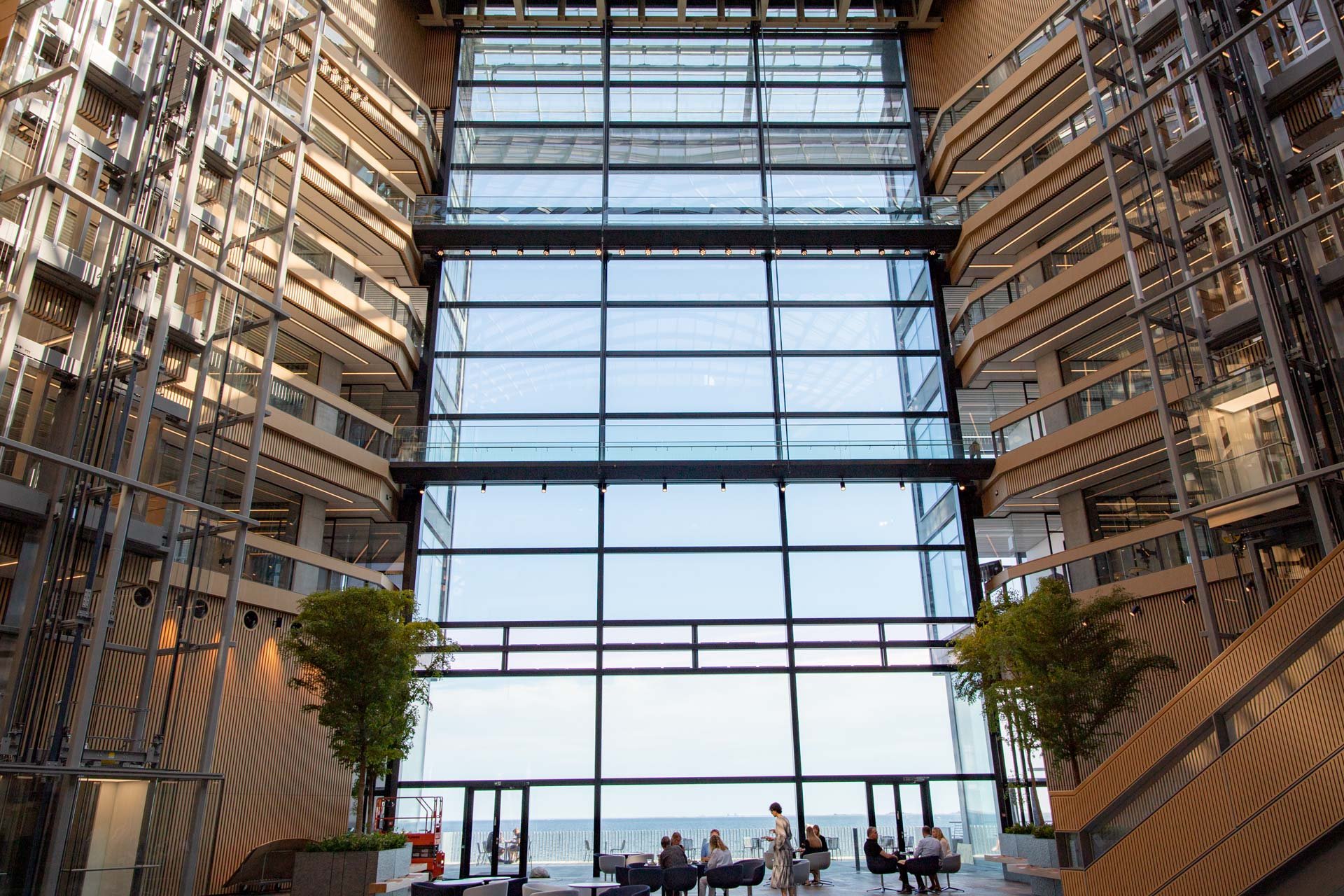 Tag nu det voluminøse panoramavindue ud mod Øresund, der strækker sig fra atriumgulvet og seks etager op til det hvælvede glastag. Det er på 630 kvadratmeter, der skal kunne holde til det store vindtryk fra havet.