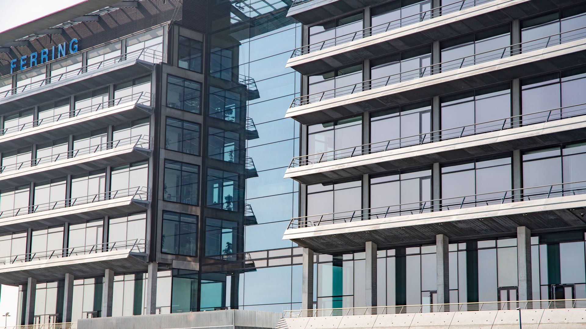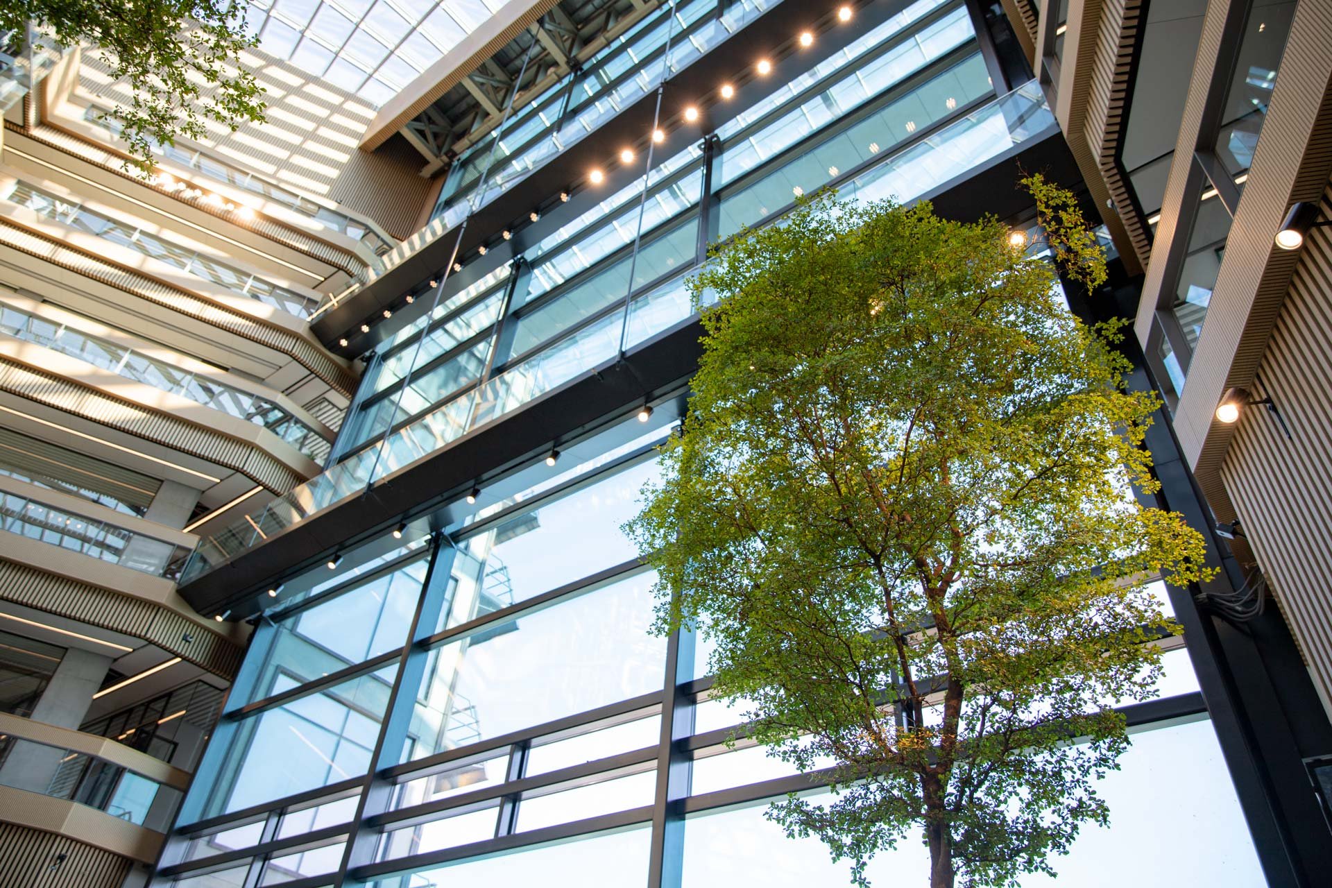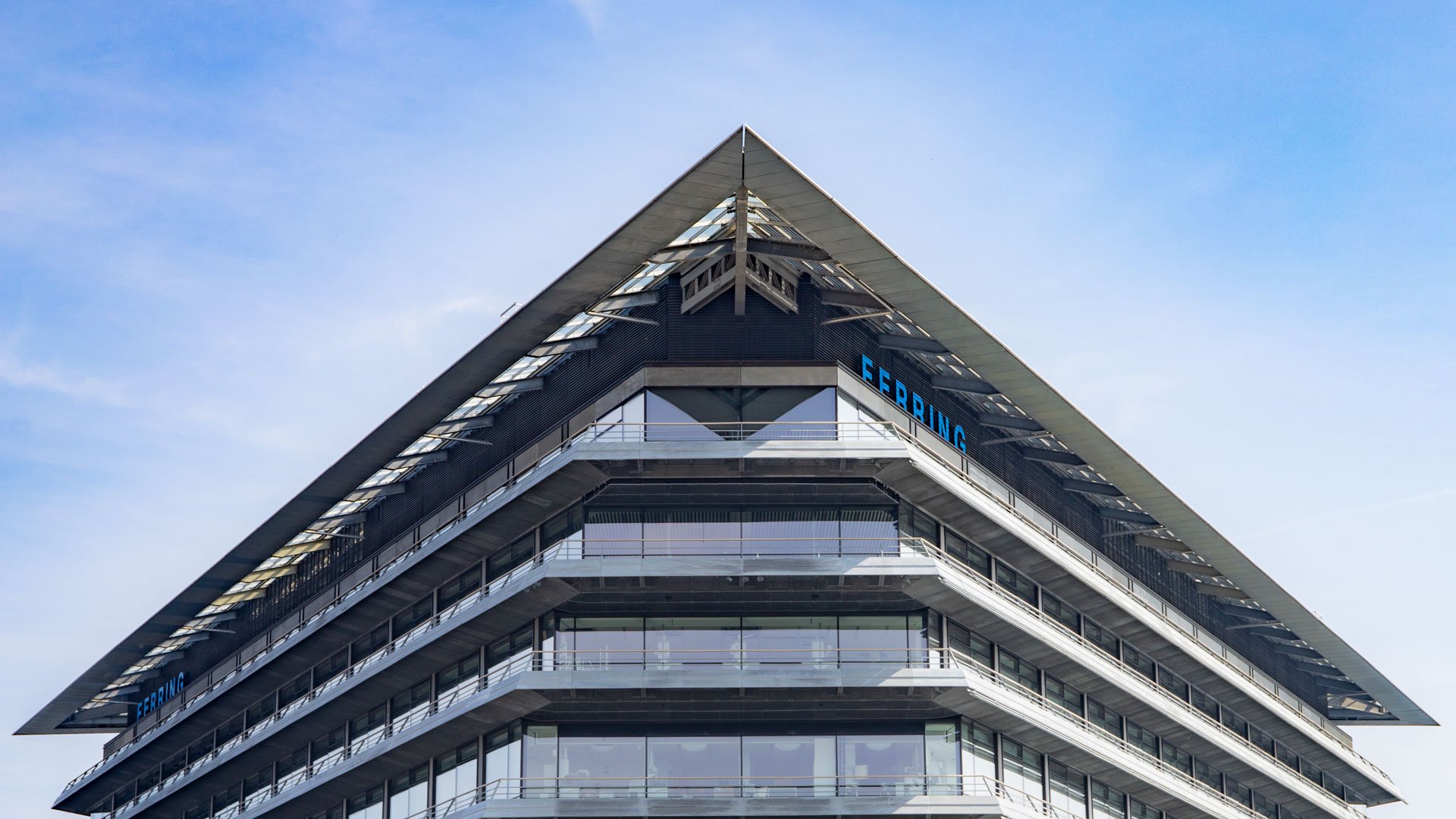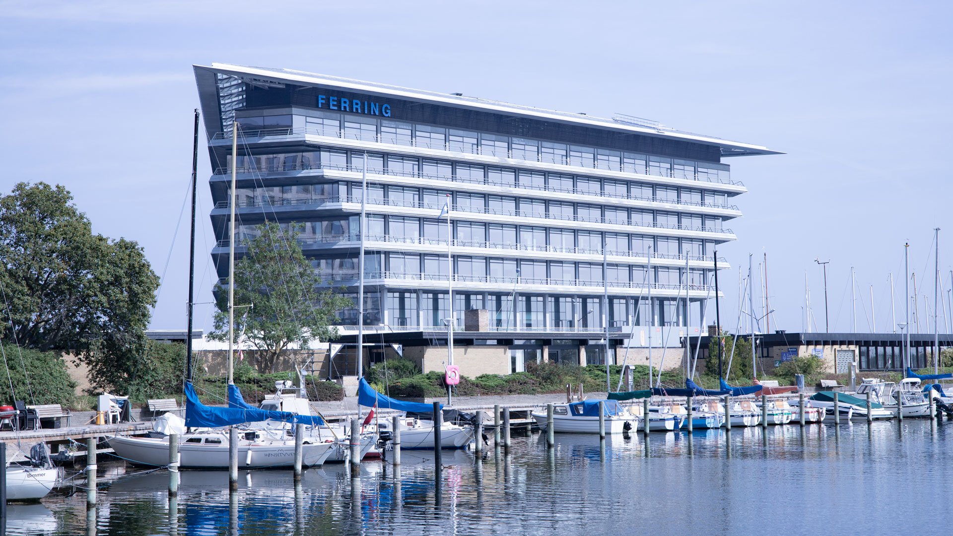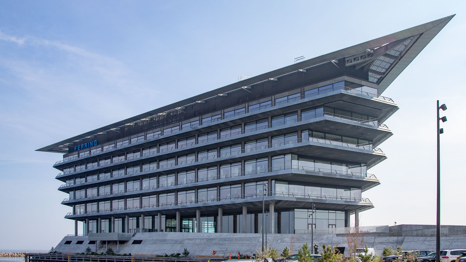 Hjertet af bygningen er det store centrale atrium på havsiden - med café under det selvbærende tag og panoramaudsigt over sundet til Malmø, hvor Ferring Pharmaceuticals i sin tid blev grundlagt.