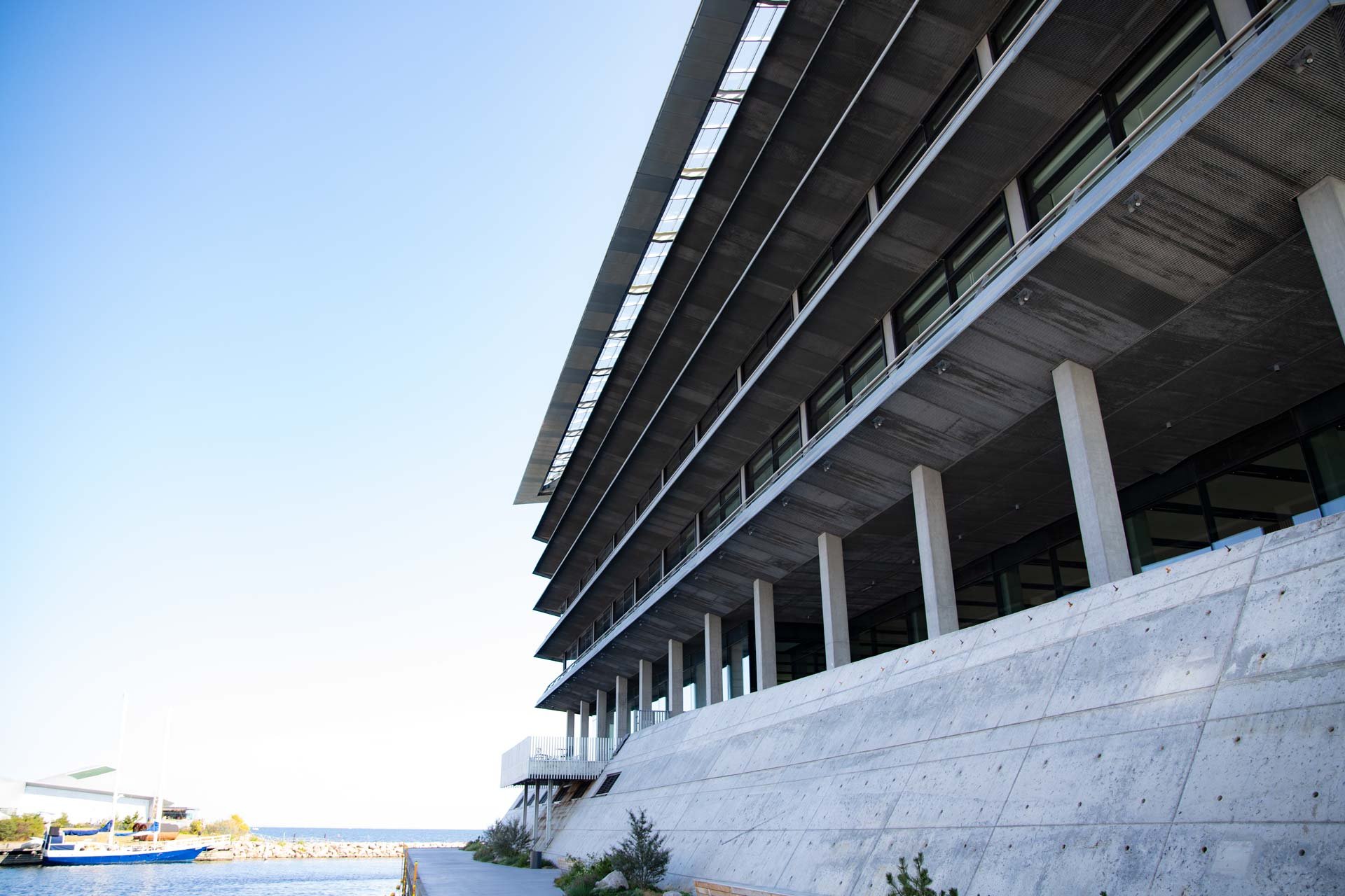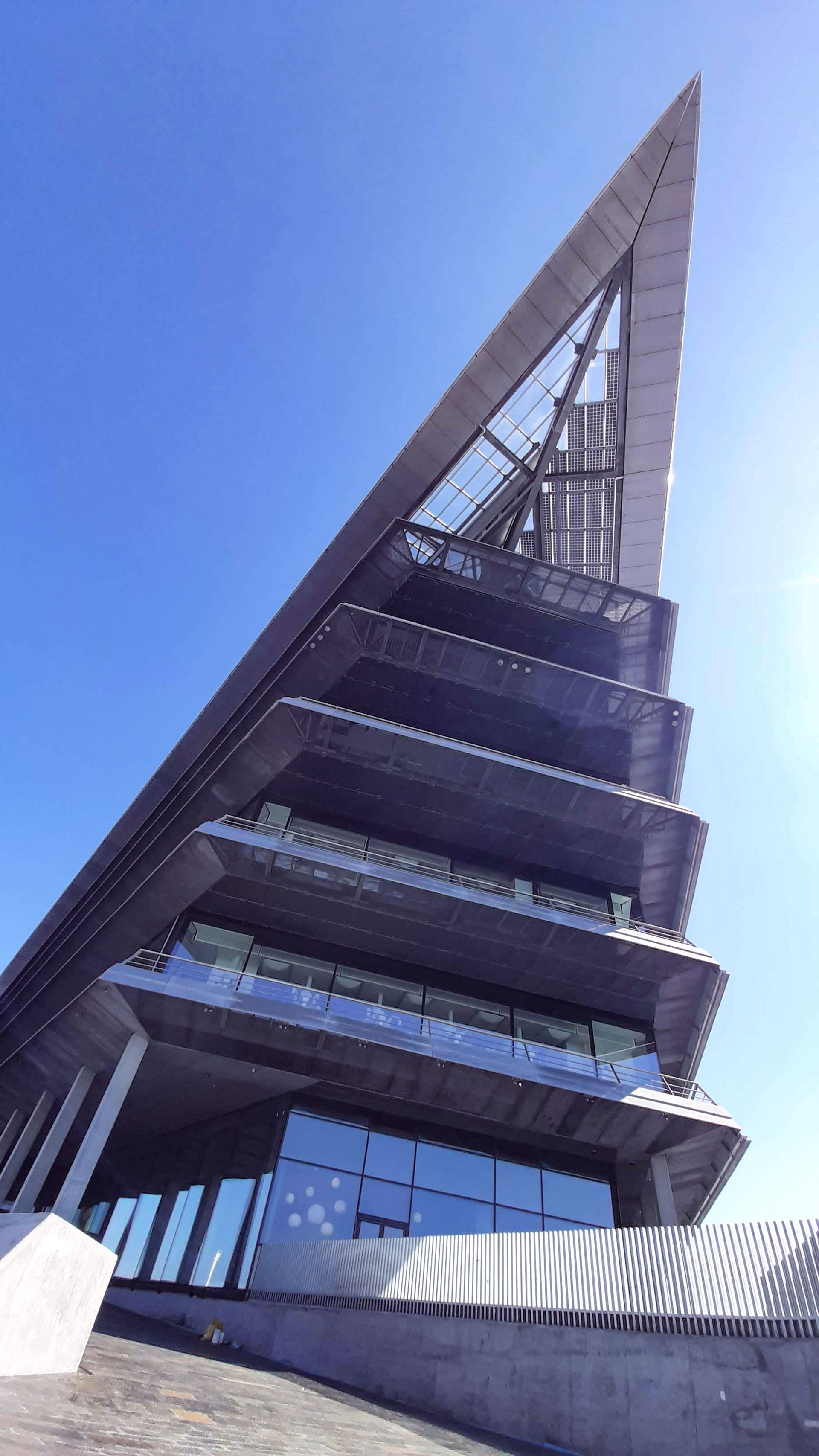 Selve bygningen er en triangulær bygning med udkragede hjørner og tag, der giver masser af luft og lys.