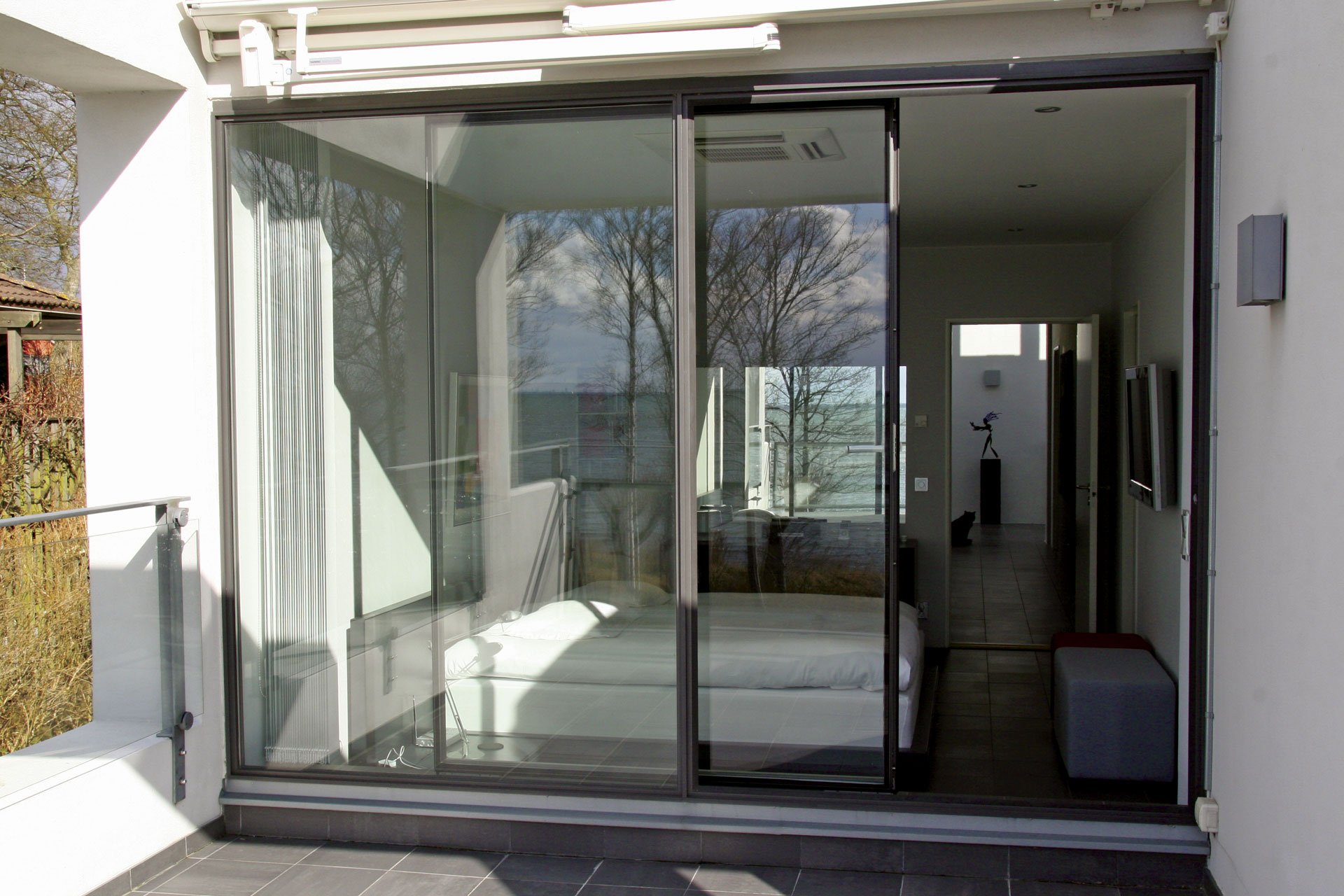 Flot minimalistisk villa med skyde-kip døre i stue, soveværelse og køkken samt skydevindue til badeværelse.