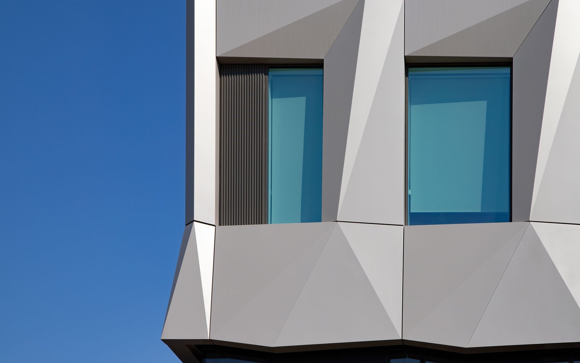 The unique facade is characterized by a mixture of champagne-colored elements and large glass panels, which are angled slightly in relation to each other, creating a dynamic and welcoming expression.