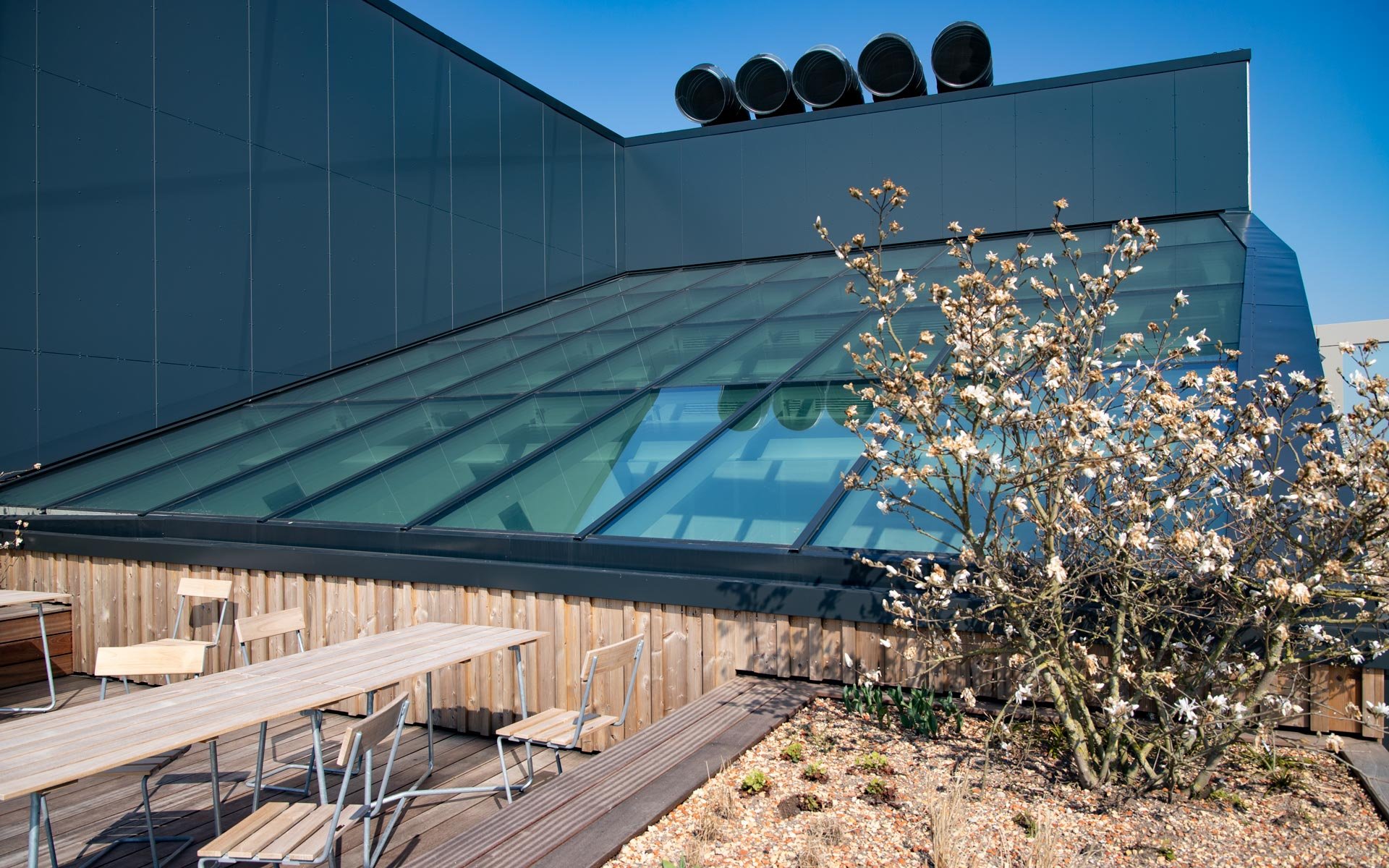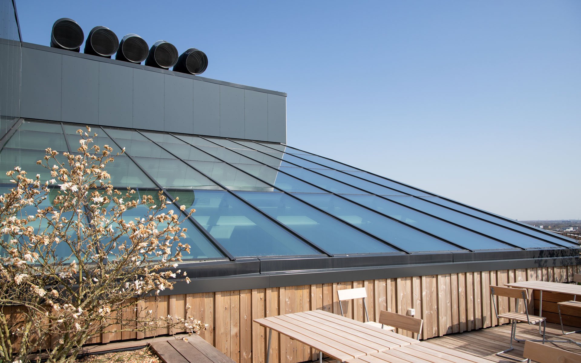 Inset facades and skylights are made of aluminum profiles in the HansenFasad system.
