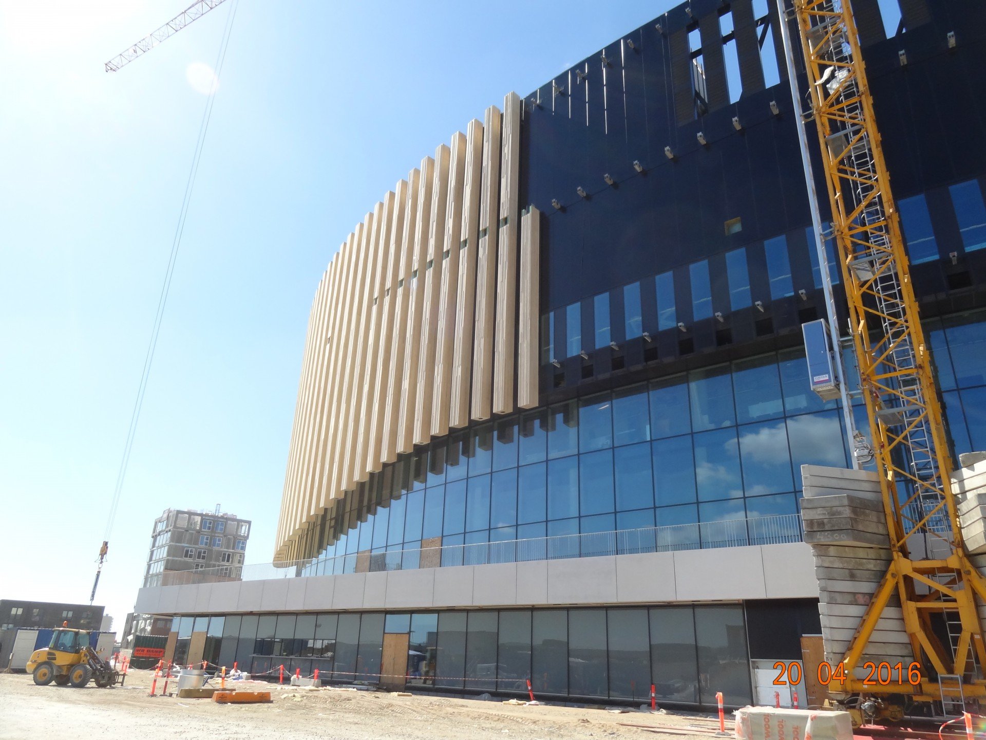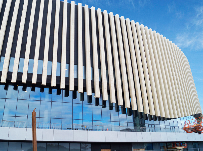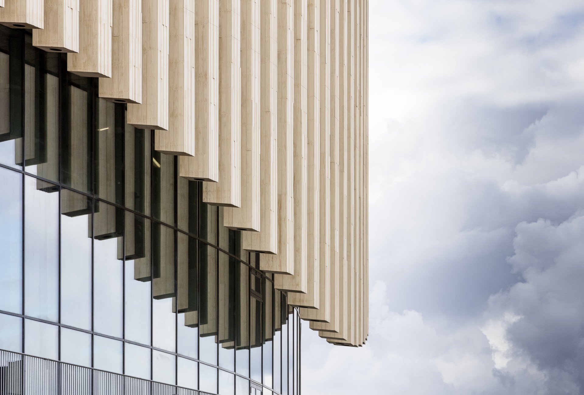The glass between the fins makes the building appear open and accessible, and the waving motion of the fins adds a playful and elegant expression to the building - kept intact via innovative solutions which allow all technical installations such as cameras, speakers, and lights, to be integrated into the facade, rather than “stuck” on to it, like known from the majority of areas before.