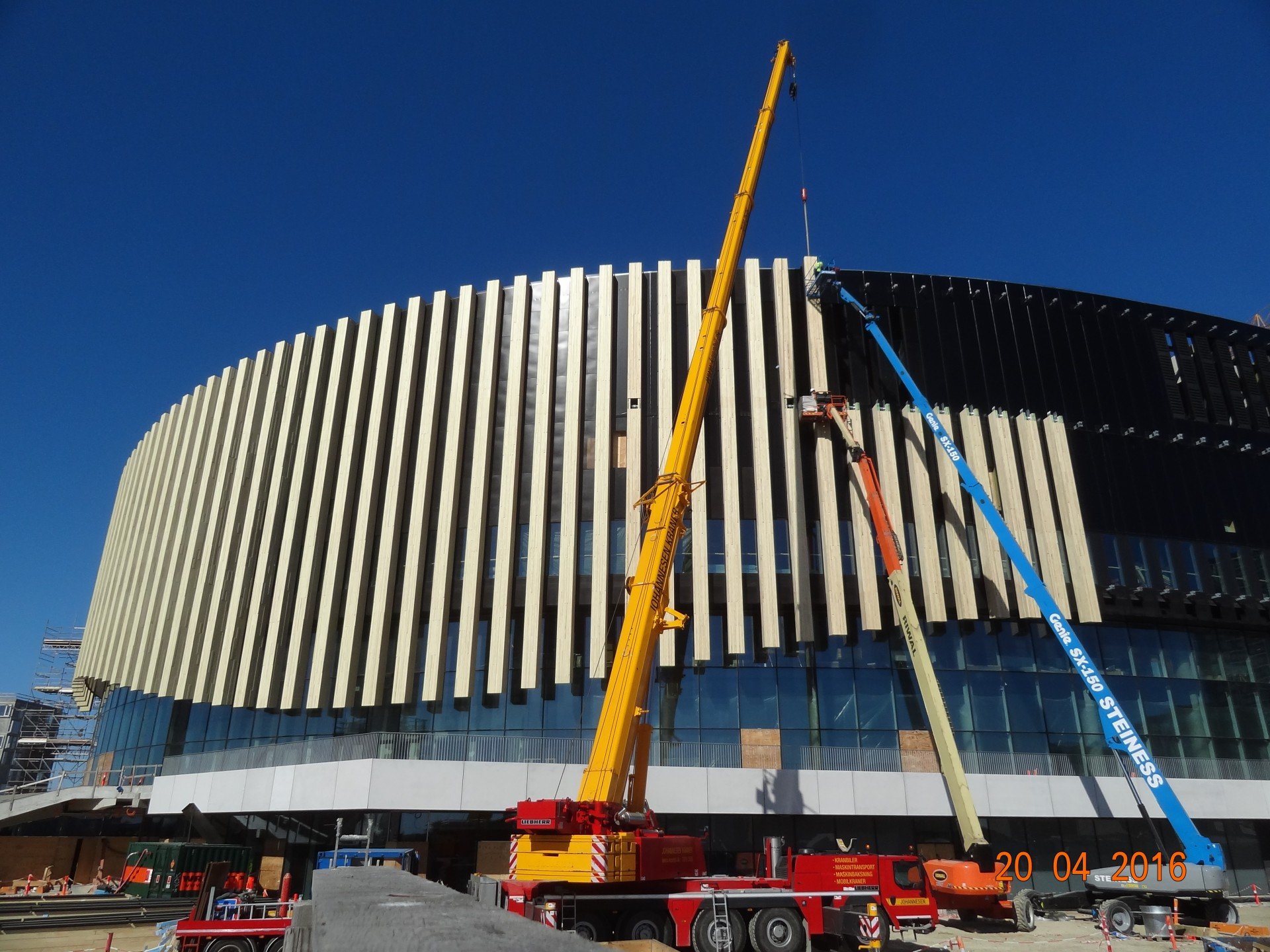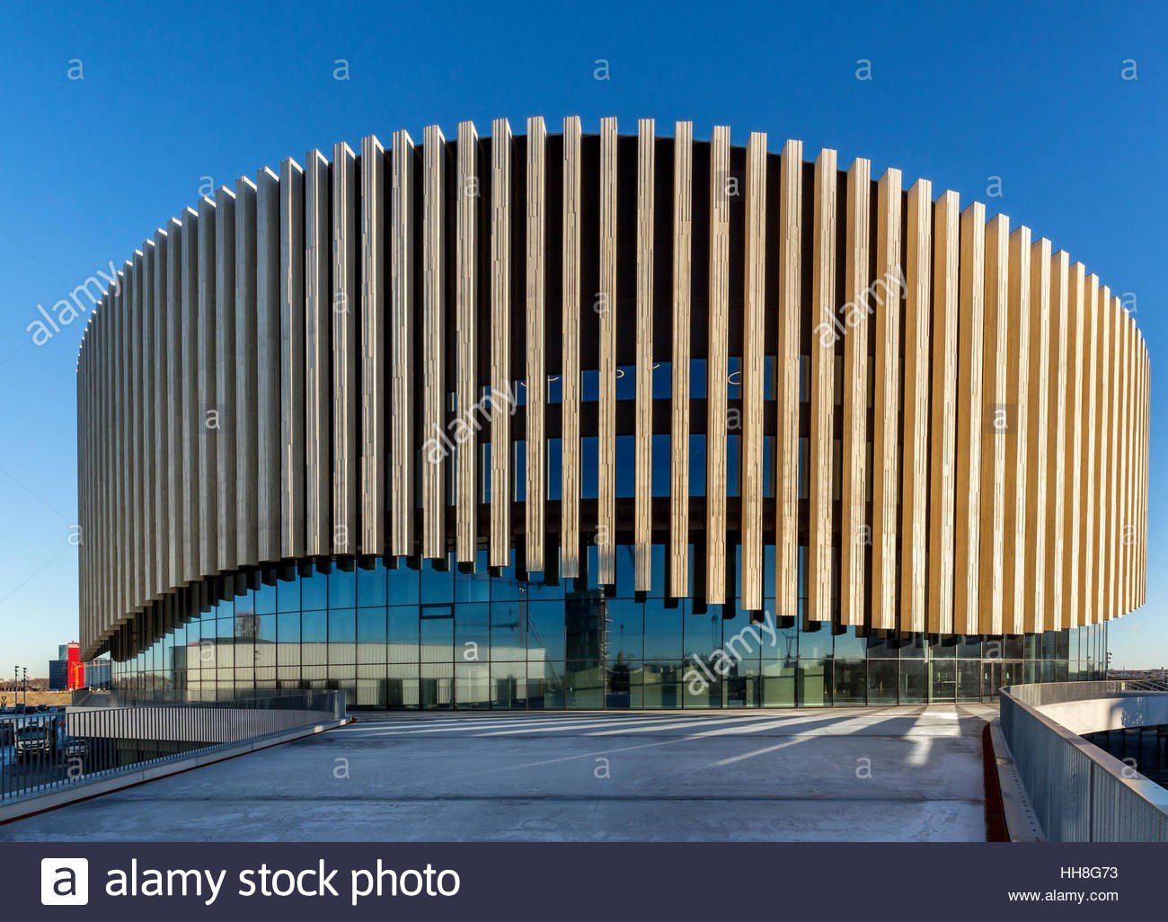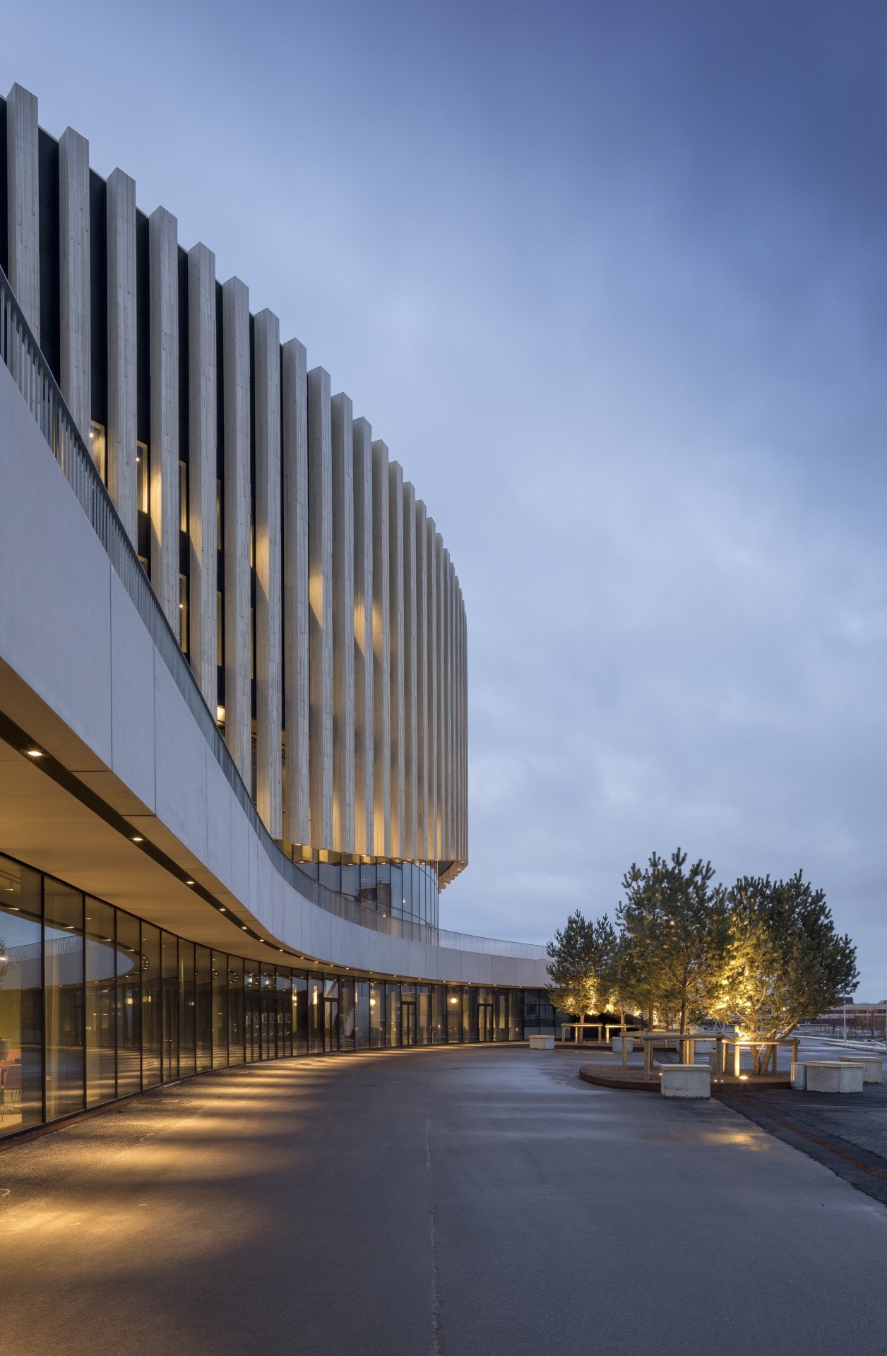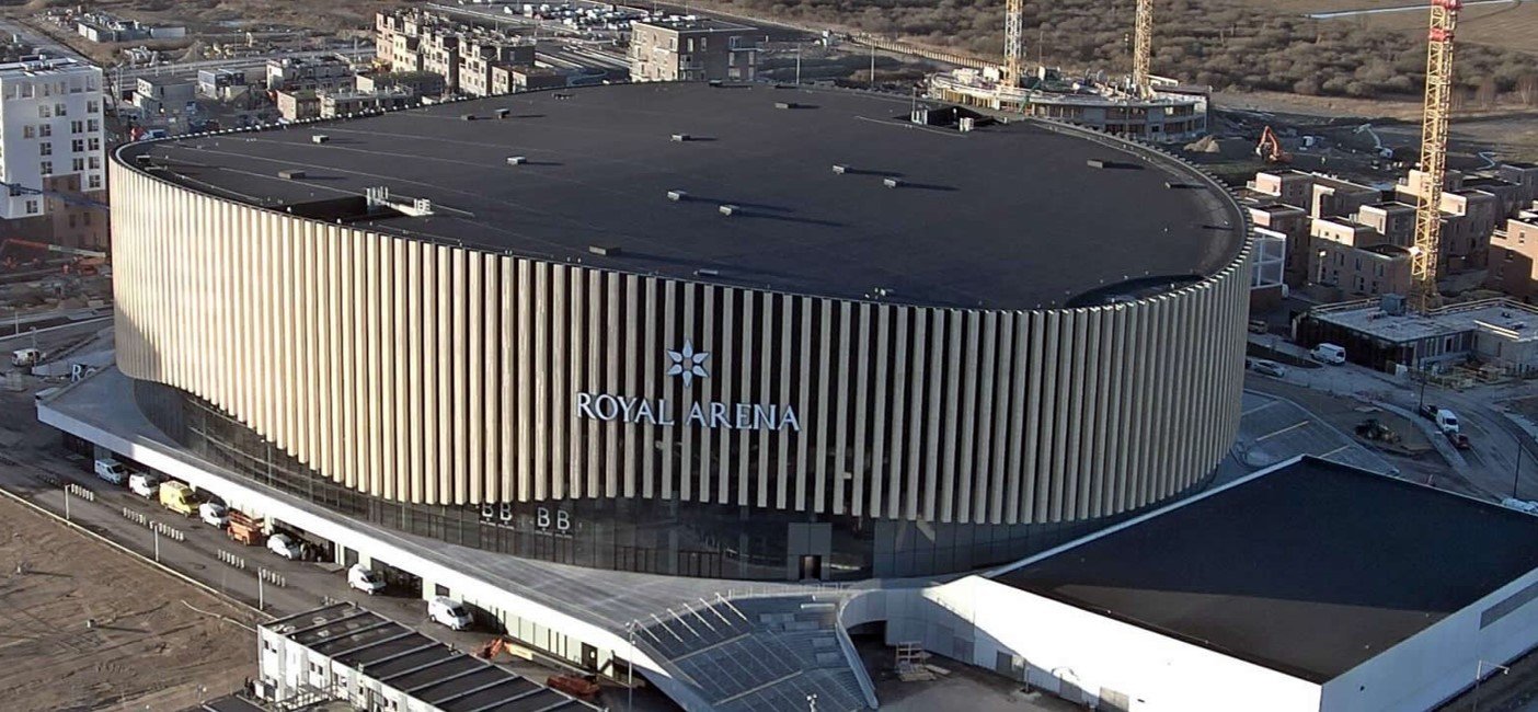 The architectural vision behind Royal Arena is divided into a plinth and a top. The top has a semi-transparent facade, where wooden fins in a warm golden color, waves on the building in a circular motion. The light elements of the exterior façade give a warmth and texture to the building; a character and identity that, although subtle from afar.